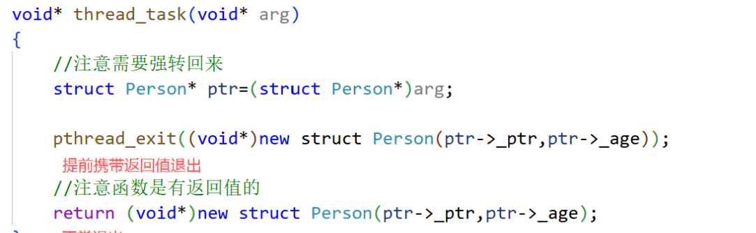 返回值的原理都是一样的:先强转为(void*)指针返回,外面需要有一个接收参数的(void*)指针,同时需要告诉线程返回值存放的位置,拿到之后再强转回来使用