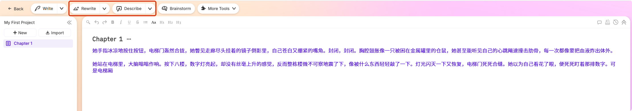 - 重写编辑(Rewrite):它不仅修正字词,更能调整叙事节奏。使用“简洁化”功能,AI会果断删减冗余的形容词和被动语态,让动作场面的文字读起来如剪辑凌厉的动作片一般干净利落。