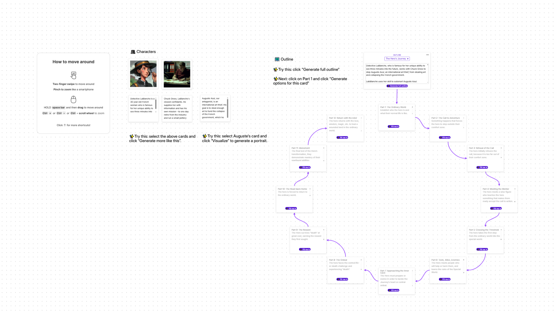 - 可视化画布(Canvas):告别贴满便利贴的墙面。在此功能中,你只需在卡片上写下关键情节点(如“抢劫失败”),AI即可将其扩展为包含具体动作的粗略场景,实现从宏观大纲到微观落地的流畅衔接。