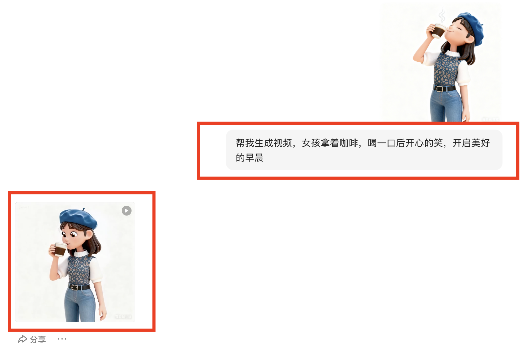 提示词:帮我生成视频,女孩拿着咖啡,喝一口后开心的笑,开启美好的早晨