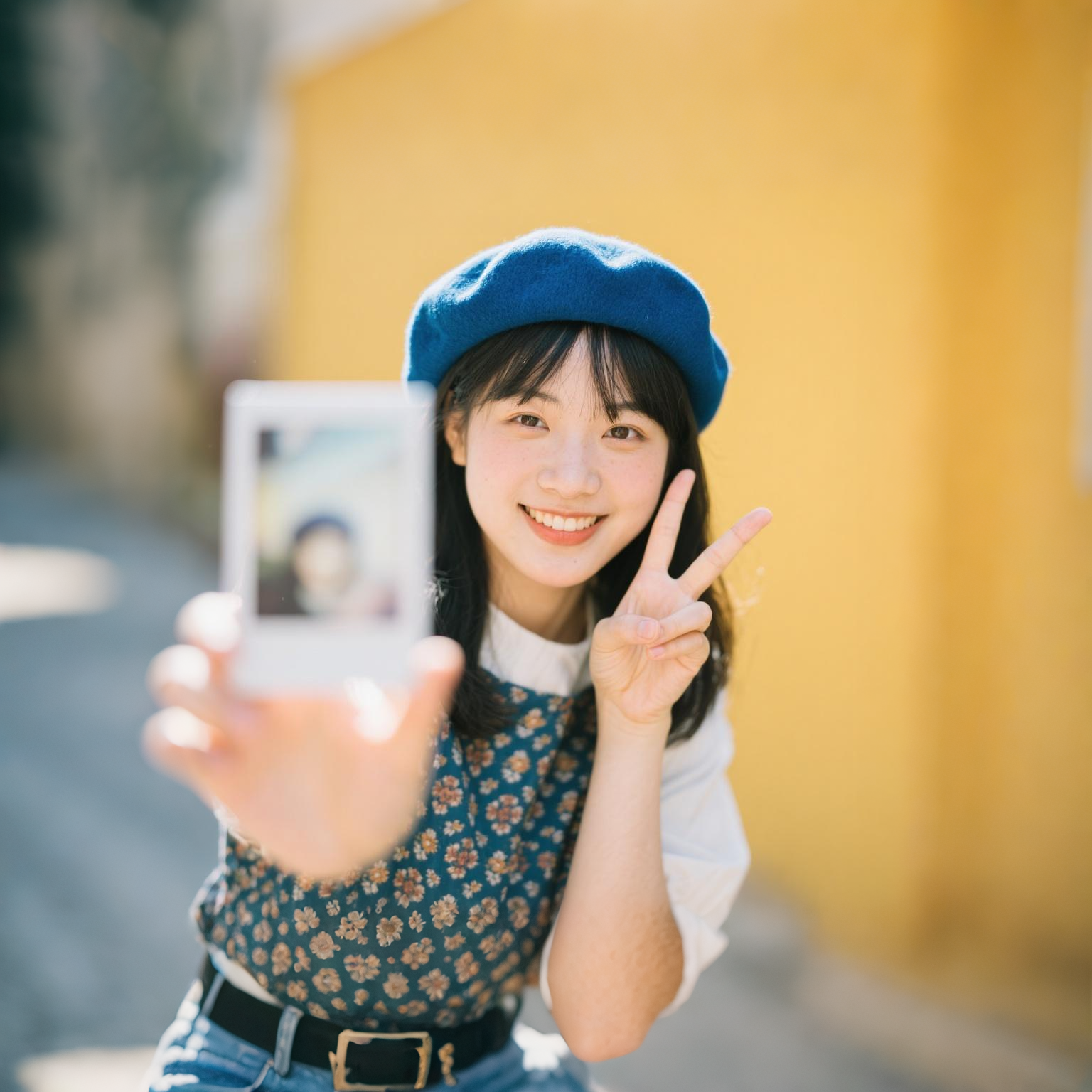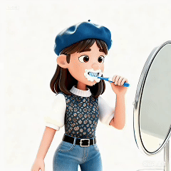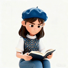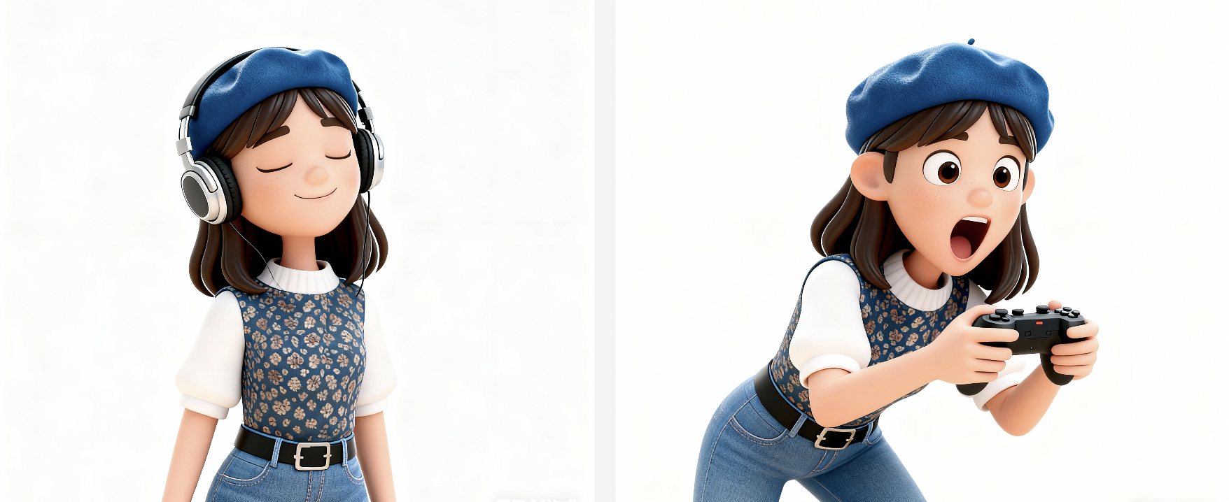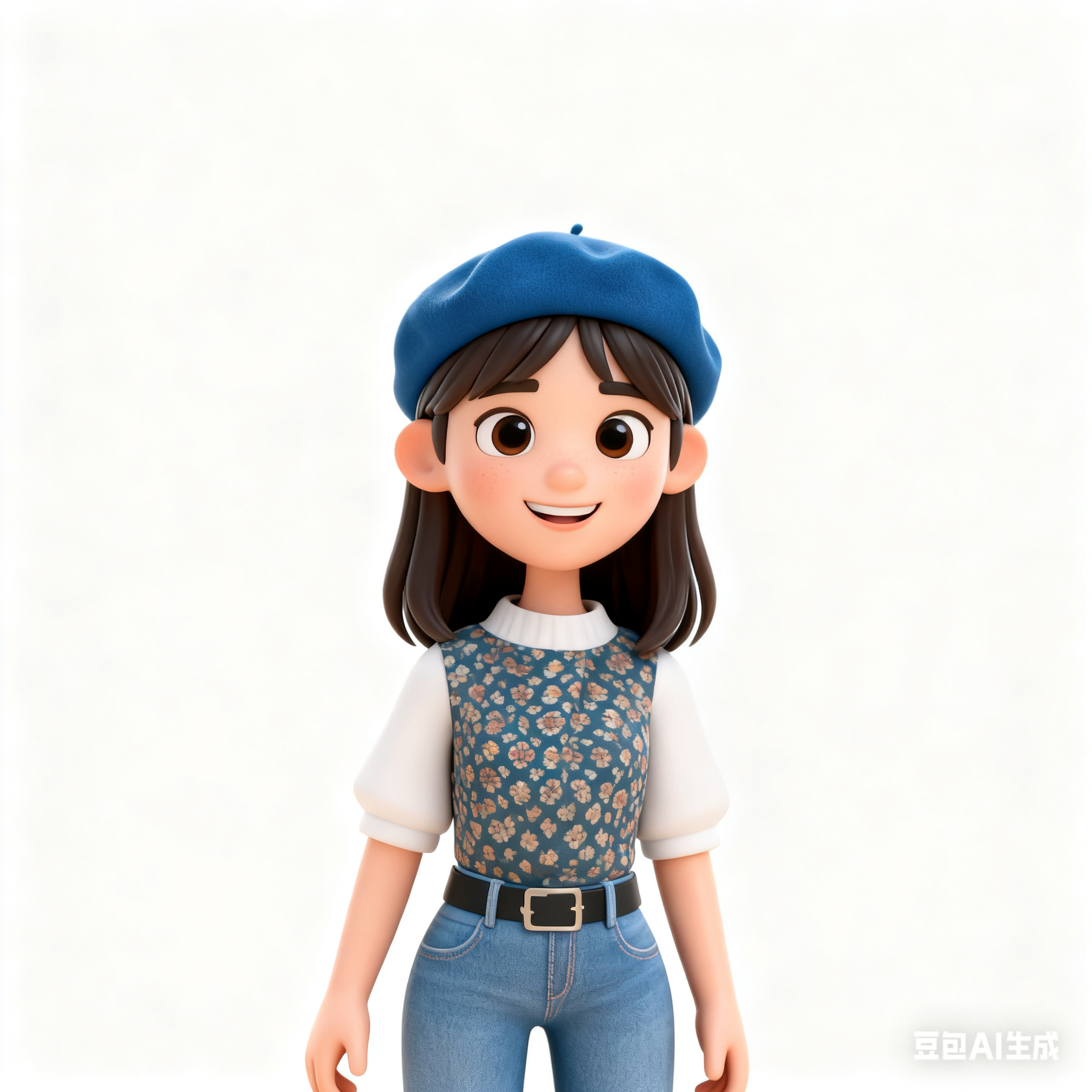 参考这个人物的面部特点,中长发,戴蓝色贝雷帽,上衣服装特点,下面穿牛仔裤,生成一个卡通3D风格的人物,站立图正面,背景是白色