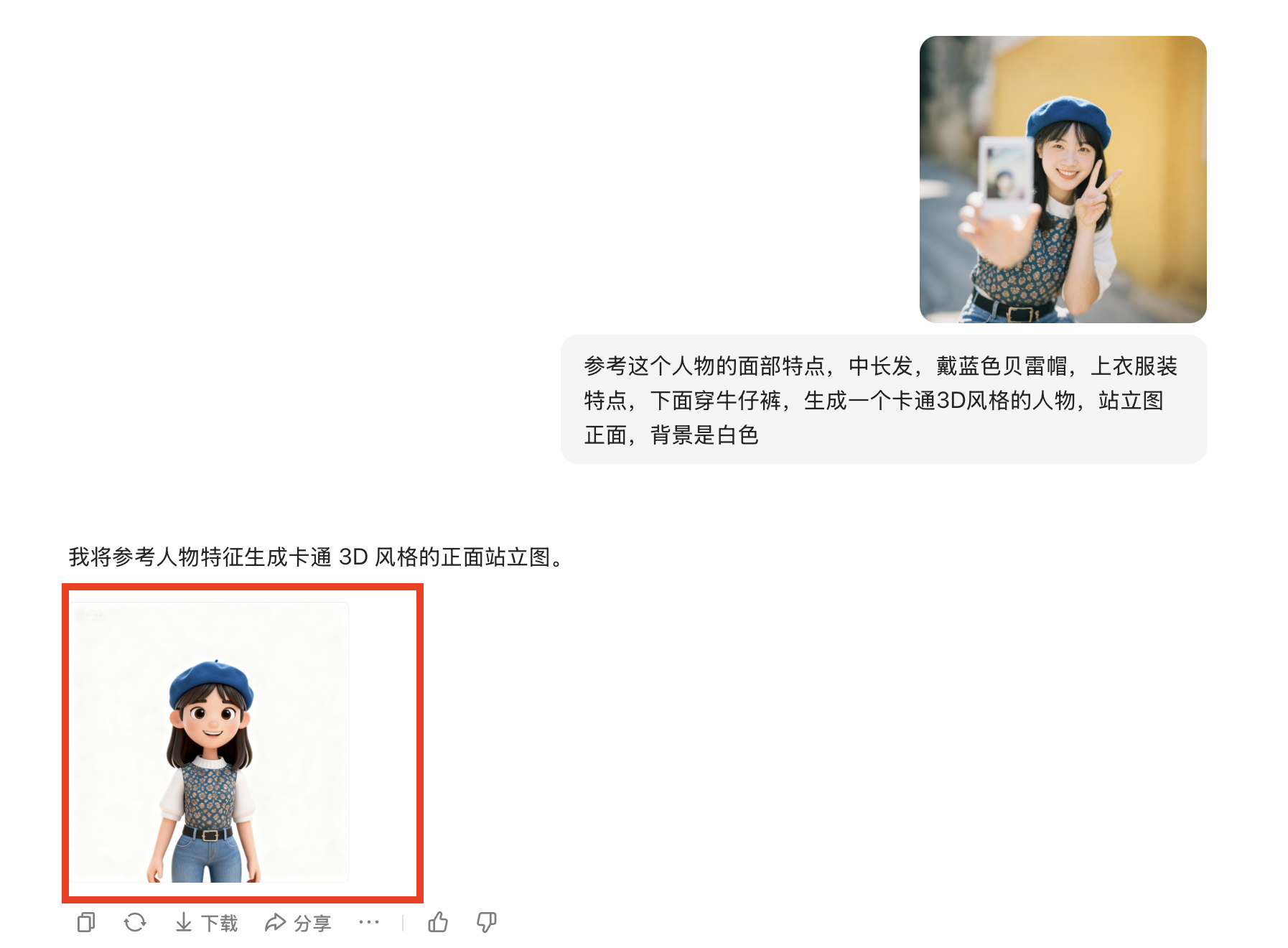 先在豆包里生成一个3D卡通版的形象,输入提示词: