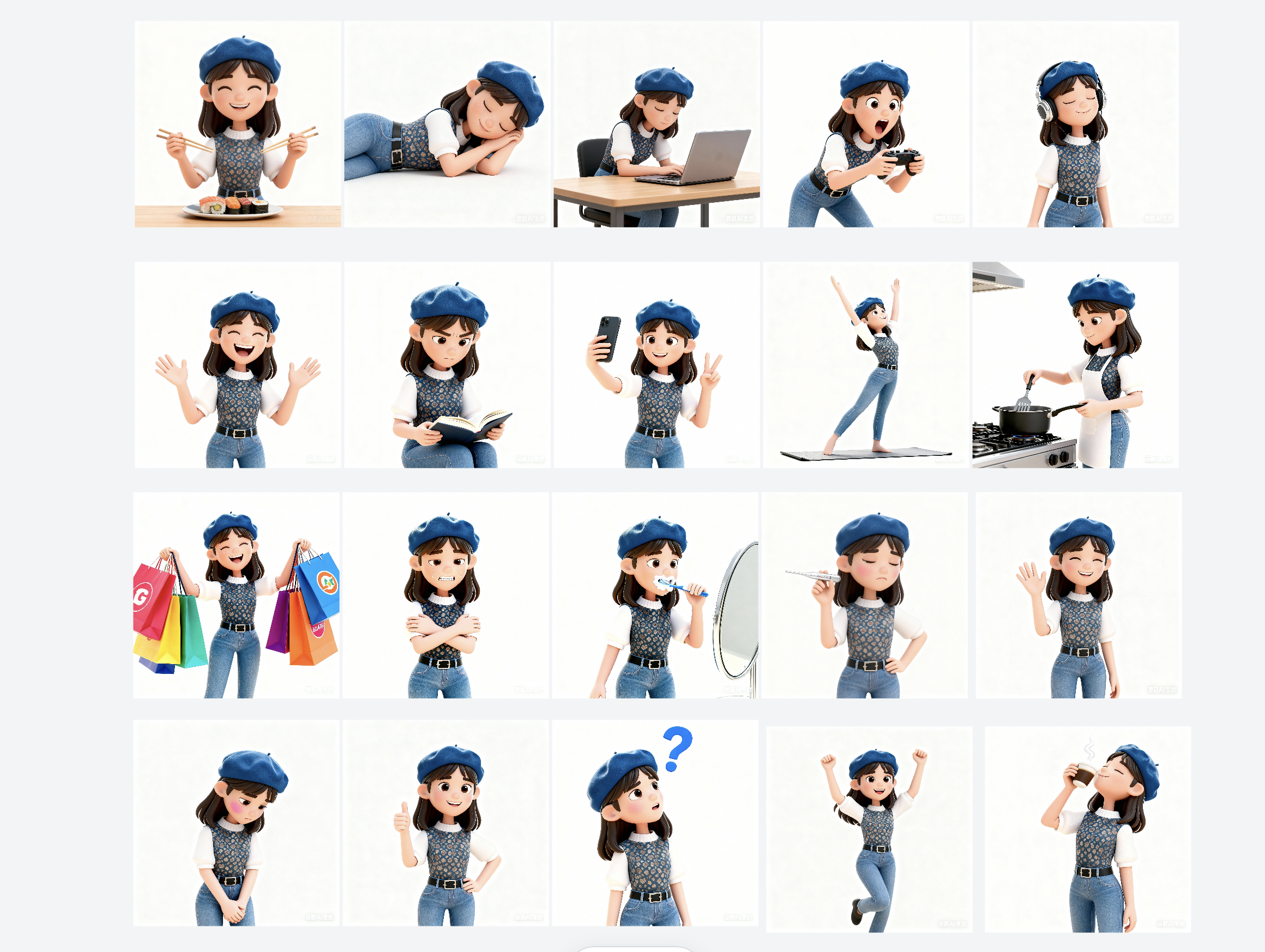 提示词:请用附件人物生成20张不同的日常生活表情包,包括吃饭,睡觉,工作加班,打游戏,听音乐,喝咖啡,开心等