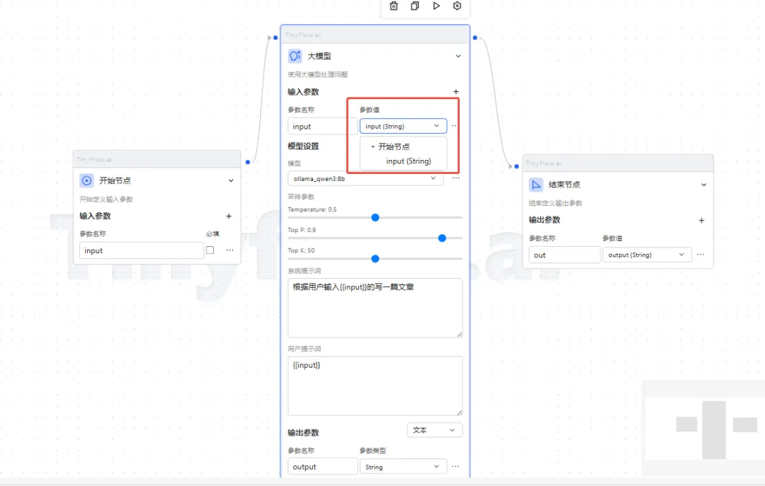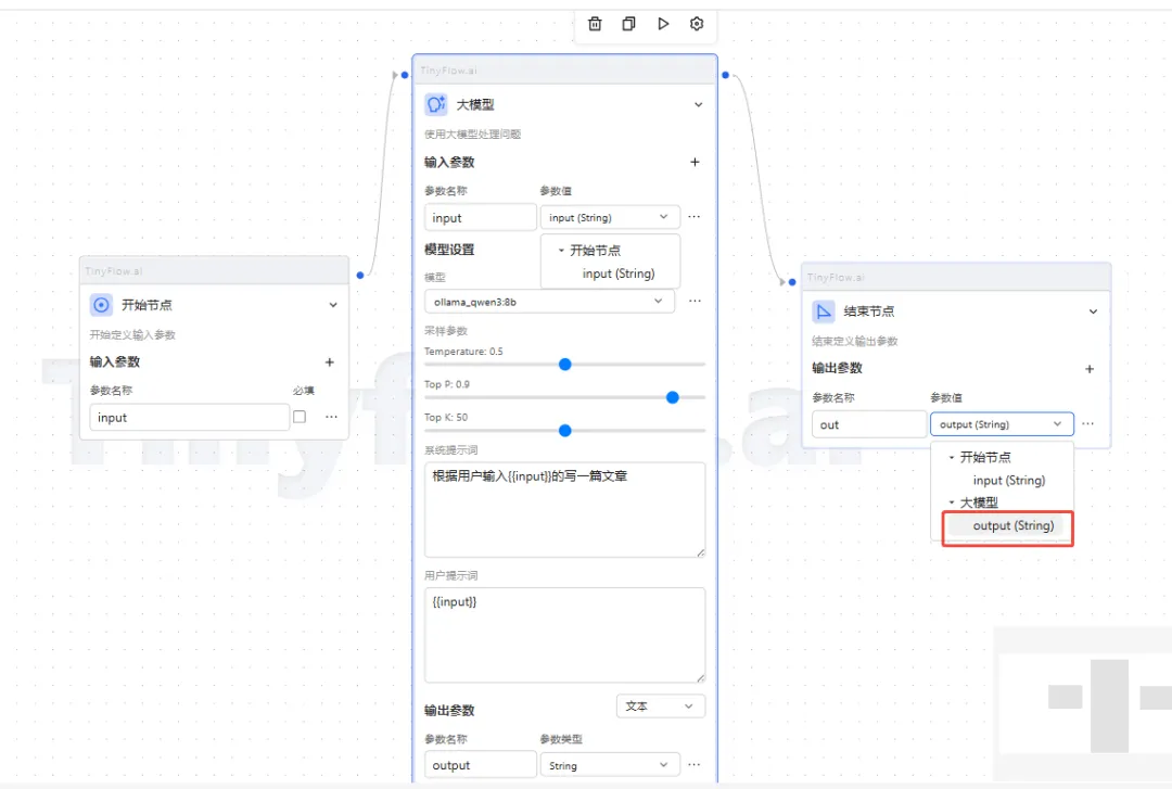 拖动 开始节点,大模型,结束节点,我们来搭建一个简单的智能体。
