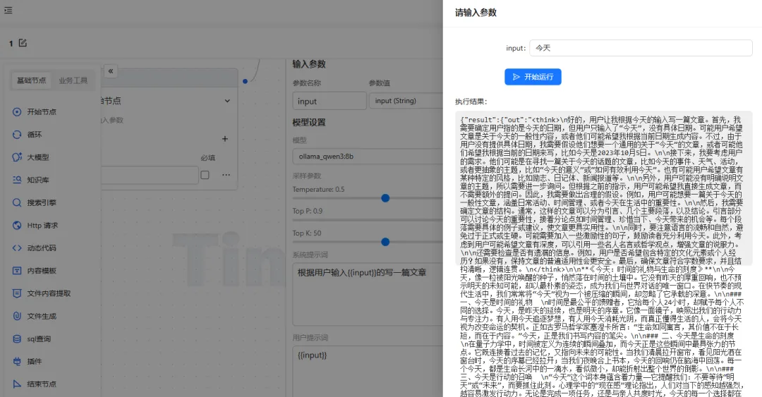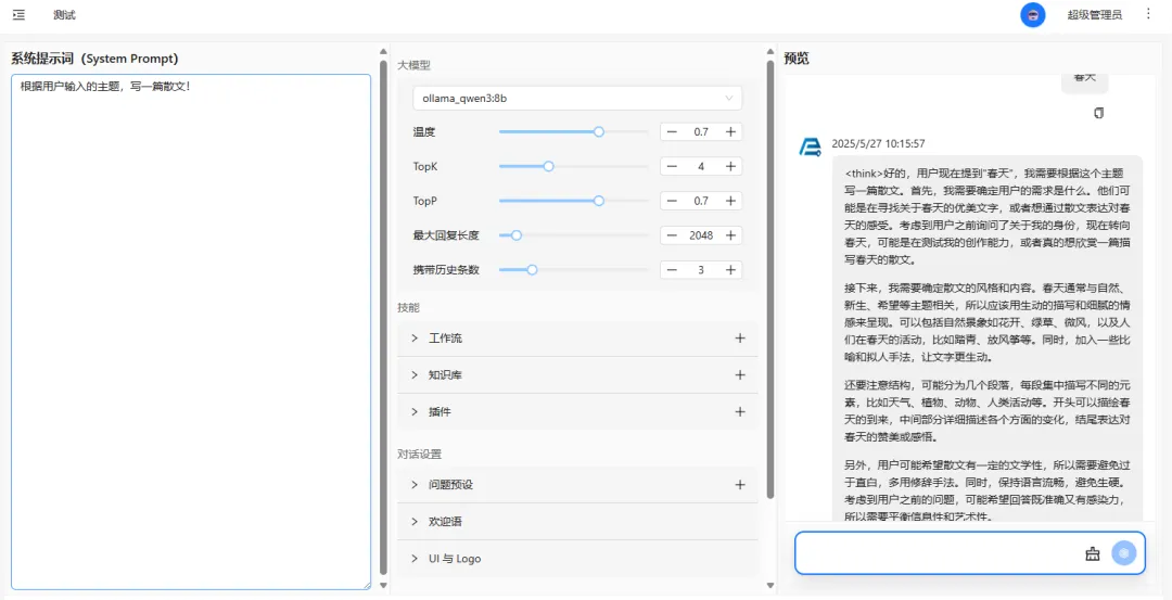 输入提示词,我们这边先简单描述,后续可根据实际情况进行优化。选择刚才我们加入的大模型。