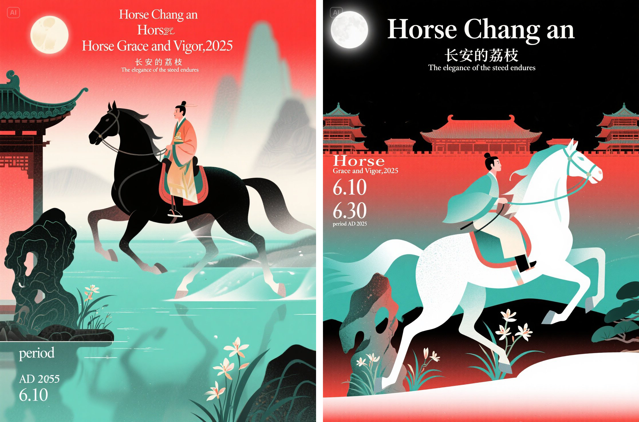 极简平面插画,留白,电影海报设计,高级,排版艺术,唐代服饰男子骑着骏马飞奔,肌理磨砂,噪点,弥散渐变,扁平插画,晕染,高饱和渐变背景,新中式扁平商业插画,几何工笔勾勒骏马轮廓,唐代美学意境,太湖石与马形轮廓融合,中式兰花兰草化作马蹄踏过的花草,背景是月亮,中式建筑飞檐化作马的装饰元素,结合新中式,超现实动态感,透明流体模拟马奔跑时带起的光影,酸性插画色系,色彩强烈,国风美学,背景有长安城皇宫的建筑剪影,冷色调为主搭配局部暖色点缀,骏马作为主体放大(毛发呈现流光质感),强烈的的渐变色,颜色明快,红黑青绿为主色,大色块、东方美学,创新构图突出马的矫健身姿与神韵,富有层次感,元素重构,日期是“6.10”和“6.30”,写着“period AD 2025”,左侧文字“Horse Grace and Vigor,2025”,上方写着“Horse Chang an”(居中放大),下方有“长安的荔枝”和“The elegance of the steed endures” |