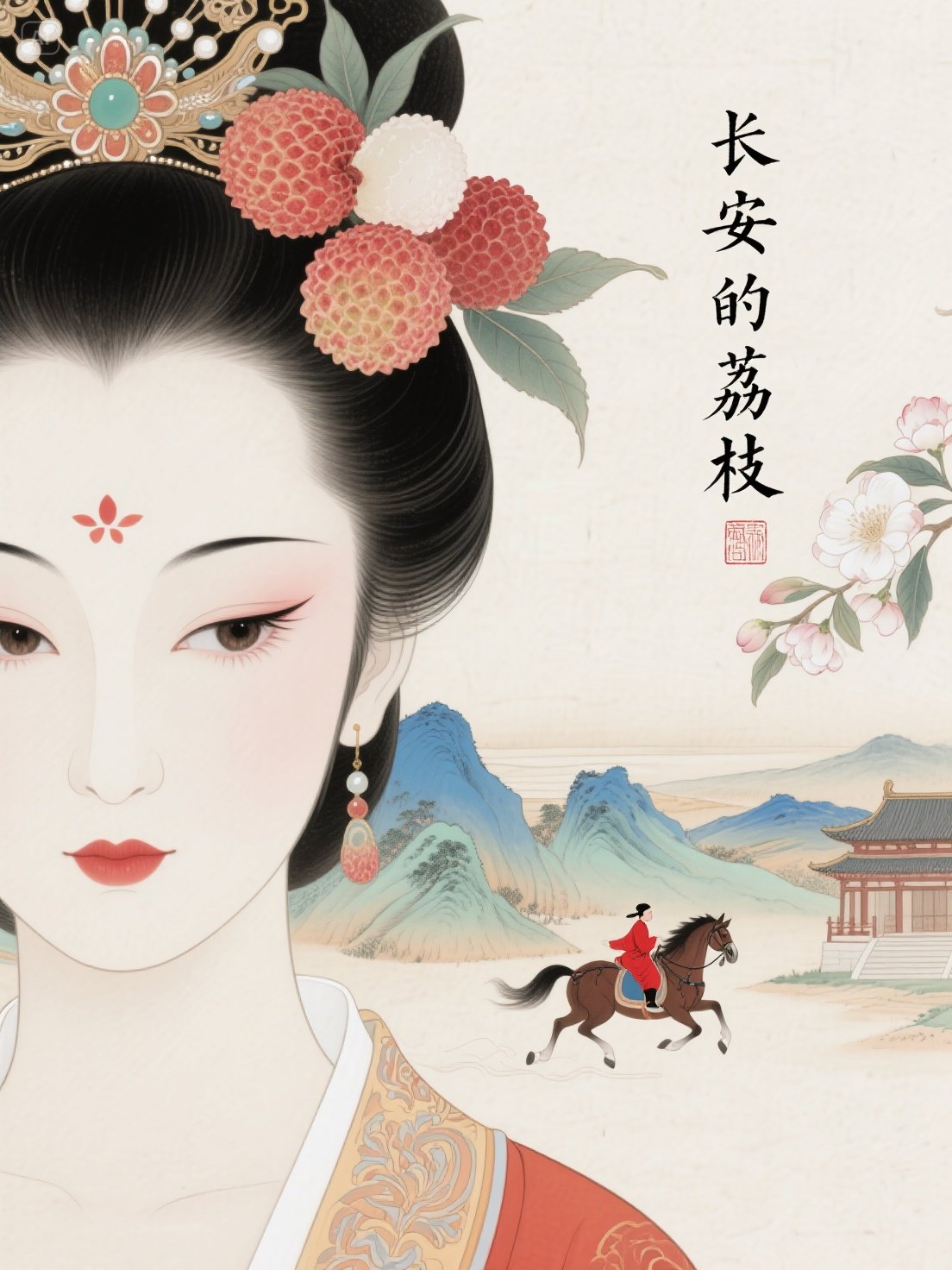 前景是贵妃古风美人特写,高冷、大眼、丹凤眼、长睫毛、华丽发饰里融入几个超大的荔枝,精美纹理服饰,背景是下方的千里江山图里,图里有个红衣小人骑着汗血宝马在飞奔疾驰,盛唐长安场景,工笔画,插画风格,特写镜头,高贵温婉氛围,大师作品风格,构图大气,高清画质,画面上方出现荔枝花和主体文字是手写的排笔字体,笔峰有力:“长安的荔枝”,印章装饰 |
