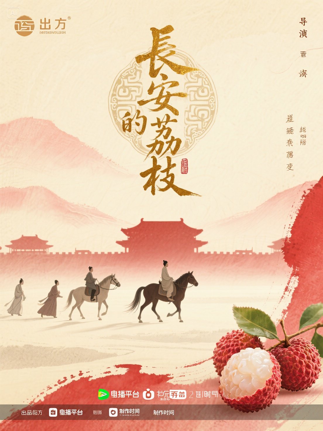 "新中式风格海报,《长安的荔枝》电视剧海报,标题“长安的荔枝”,古风水墨画风格,荔枝元素,大唐建筑背景,金色和红色为主色调,毛笔字标题,中国传统纹样装饰,电影海报质感,高清,2K分辨率" |