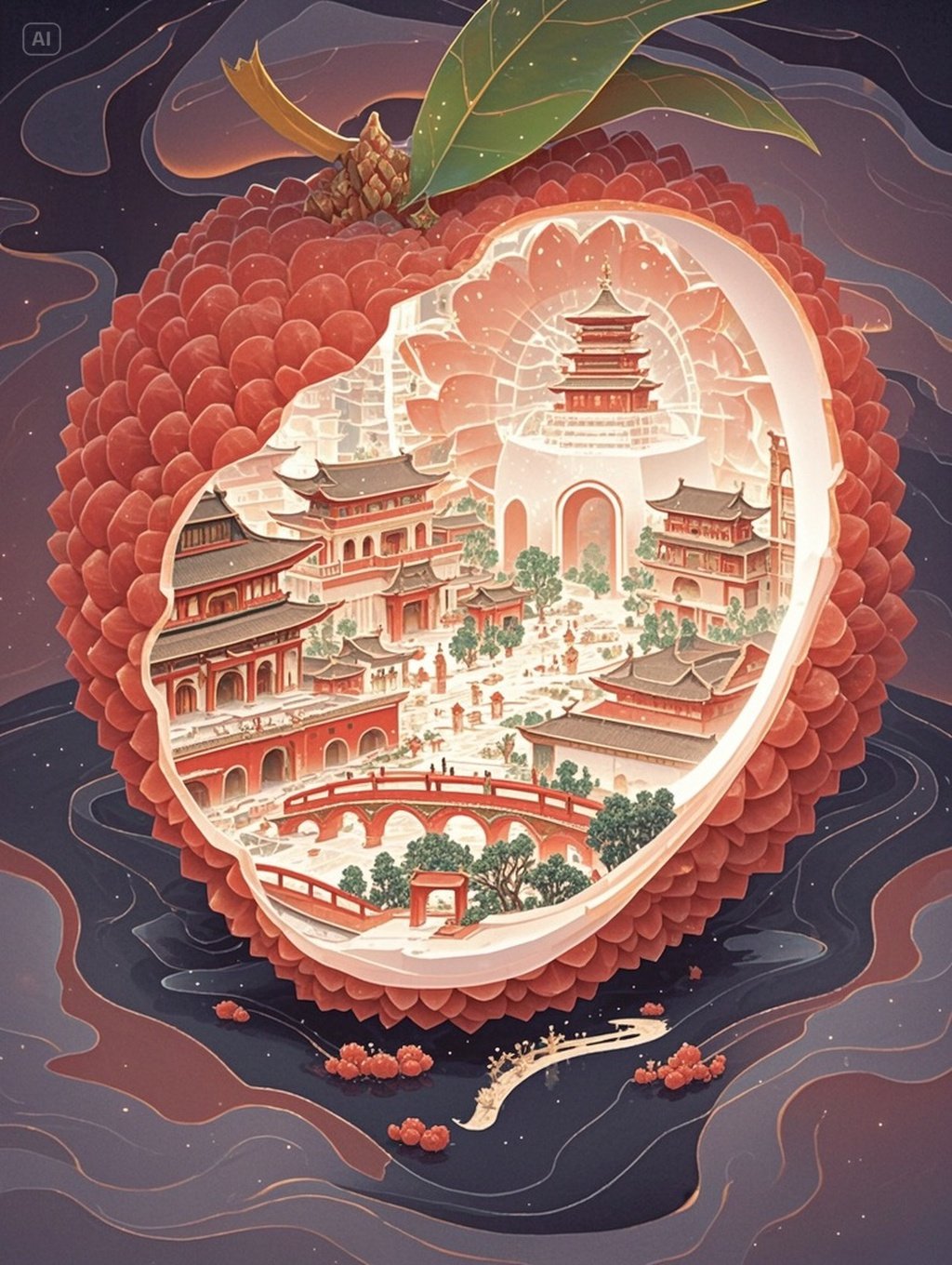 这是一幅采用新中式2.5D奇幻插画风格创作的视觉作品,主题为“长安的荔枝”,整幅画以一颗巨大而晶莹剔透的荔枝为视觉焦点,荔枝外壳经过艺术化雕刻处理,呈现镂空结构,构图上采取了宏观幻想视角,将一整座古代中国长安城隐藏在荔枝的内部之中,形成“果中藏城”的奇幻意境。荔枝被夸张化放大,占据整个画面主体,果皮呈现半透明状态,纹理细致仿佛玉石或琉璃雕刻。镂空部位像是窗格、拱门、裂缝般自然开启,透出内部如梦似幻的城市景观。荔枝内壁构成城市轮廓的边界,街道、楼宇、桥梁、行人皆依果肉走势排布,形成奇幻又秩序井然的内嵌世界。荔枝内部是唐代长安的缩影,高楼飞檐、灯火辉映,宫殿楼宇错落有致。画中可见红墙金瓦、朱门雕栏,青砖石道蜿蜒穿行于城中,文人雅士、市井百态、车马往来穿梭其中,细节丰富而生动,传递出盛唐时期的都市繁华与文化底蕴。构图采用透视俯视结合的叙事方式,荔枝半剖或悬浮于画面正中,果壳形成天然的画框。荔枝下部或背景部分为深色流动云雾,进一步增强神秘气氛。长安城嵌入荔枝中心,层层递进的街区与建筑在镂空果壳内若隐若现,使观者仿佛窥视一个压缩又庞大的时空宇宙。色彩选用深蓝、赤红、晶白、柔金与墨绿为主,呈现出温润高贵的东方色调。荔枝外壳多使用赤玉色与金边描绘,果肉区域透出白金柔光,而城中灯火、人物衣袂点缀其中,如微光跃动,构建出充满东方诗意的梦幻氛围。光影部分极具空间层次感,画面采用顶部柔光与内部点光源配合,使荔枝镂空处如穹顶照明,长安城在果实的光晕中泛出朦胧光彩。建筑与荔枝结构交汇之处设有高斯模糊与动态光影处理,使空间显得流动、透明又空灵。字体建议使用金色手写魏碑或小篆,排布于画面右上或荔枝果皮周围,内容推荐为长安的荔枝”“荔藏盛世”“一果千城”等,以增强主题叙事性和艺术性,整体画面梦幻、奇妙又富有文化穿透力,适合视觉KV、影视剧概念图、文创产品主封面等多场景应用。 |