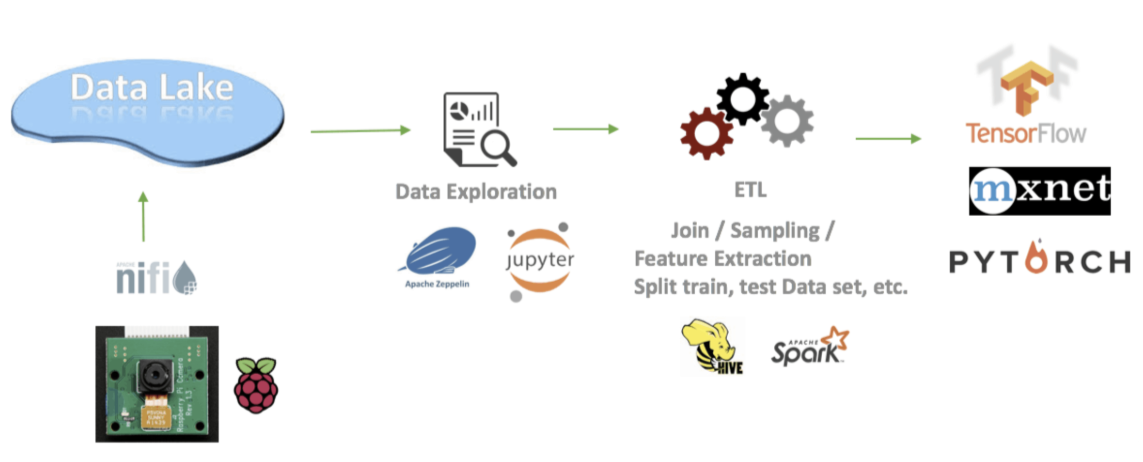 典型的深度学习工作流程:数据从各个终端(或其他来源)汇聚到数据湖中。数据科学家可以使用笔记本进行数据探索,创建 pipelines 来进行特征提取/分割训练/测试数据集。并开展深度学习和训练工作。这些过程可以重复进行。因此,在同一个集群上运行深度学习作业可以显著提高数据 / 计算资源共享的效率。