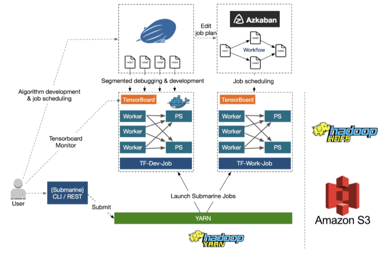 Submarine 计算引擎通过命令行向 YARN 提交定制的深度学习应用程序(如Tensorflow, Pytorch等)。这些应用程序与 YARN 上的其他应用程序并排运行,例如 Apache Spark,Hadoop Map/Reduce 等。