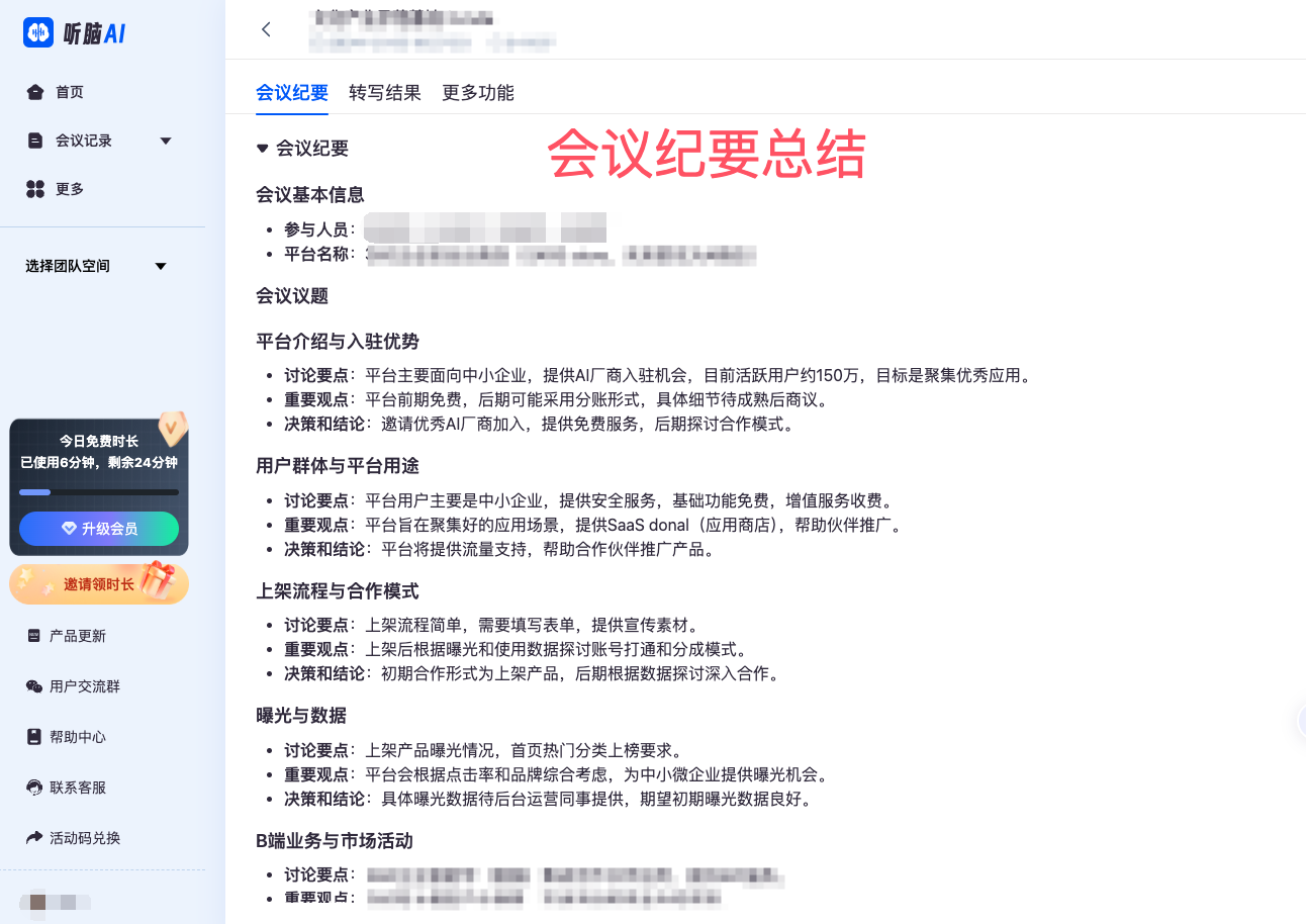 4.实时录音结束,会议纪要呈现,系统会自动生成重要信息。