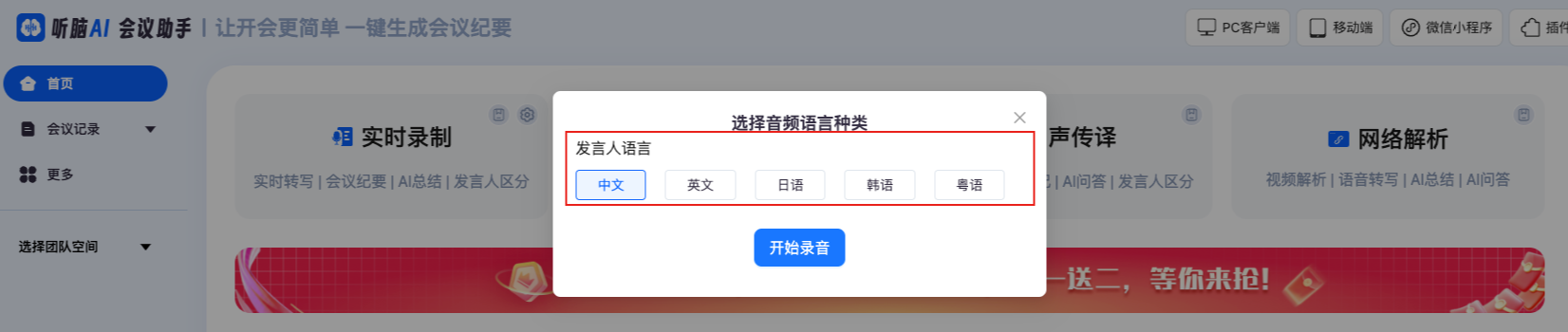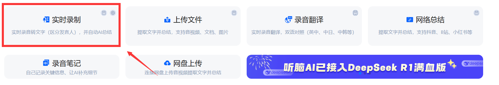 1.打开听脑AI客户端(手机、电脑都能用),选择“实时录音转文字”;