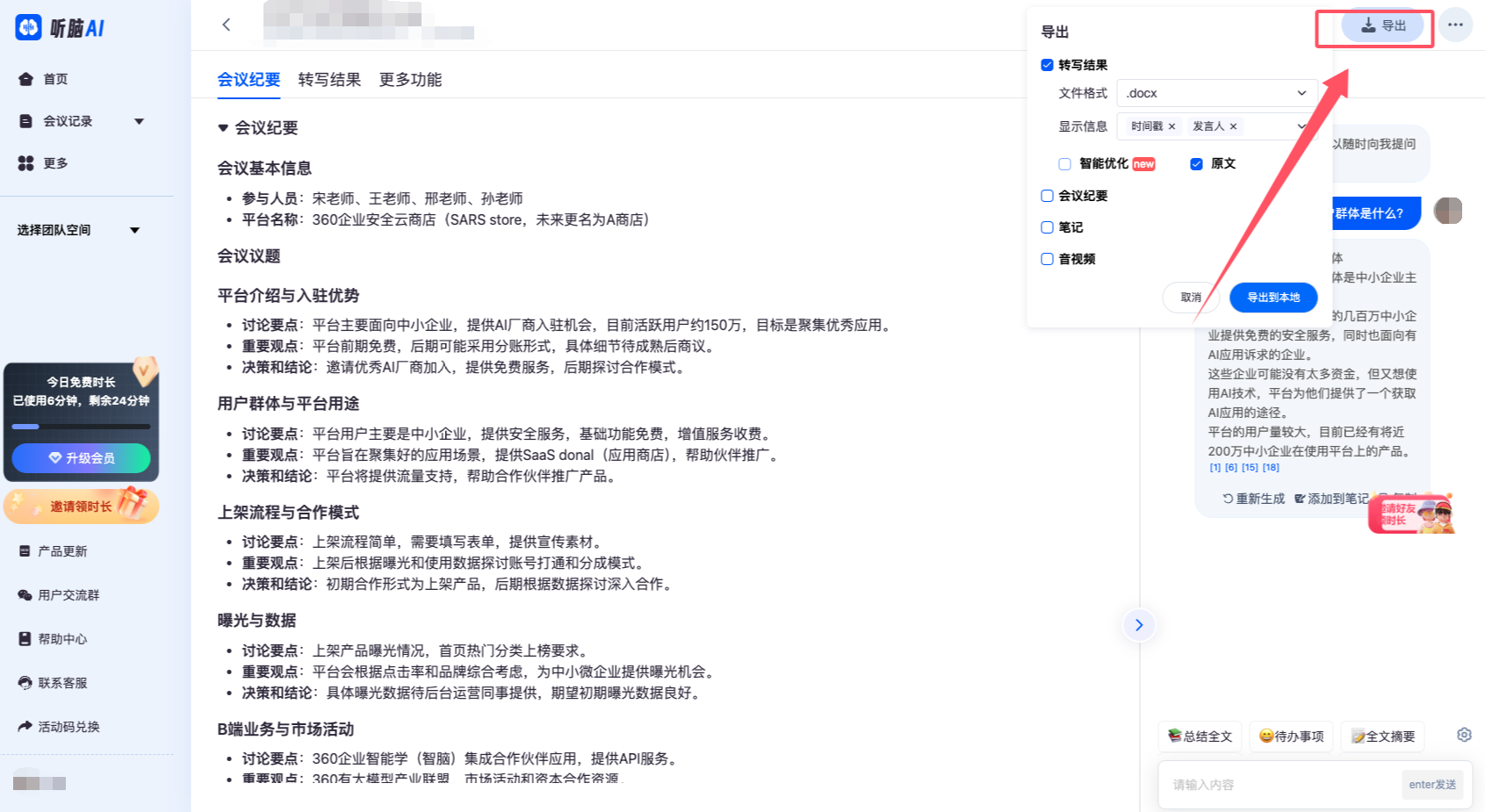5.会议结束后,点击右上角“导出”,导出到本地文件夹,有多种文件格式选择。