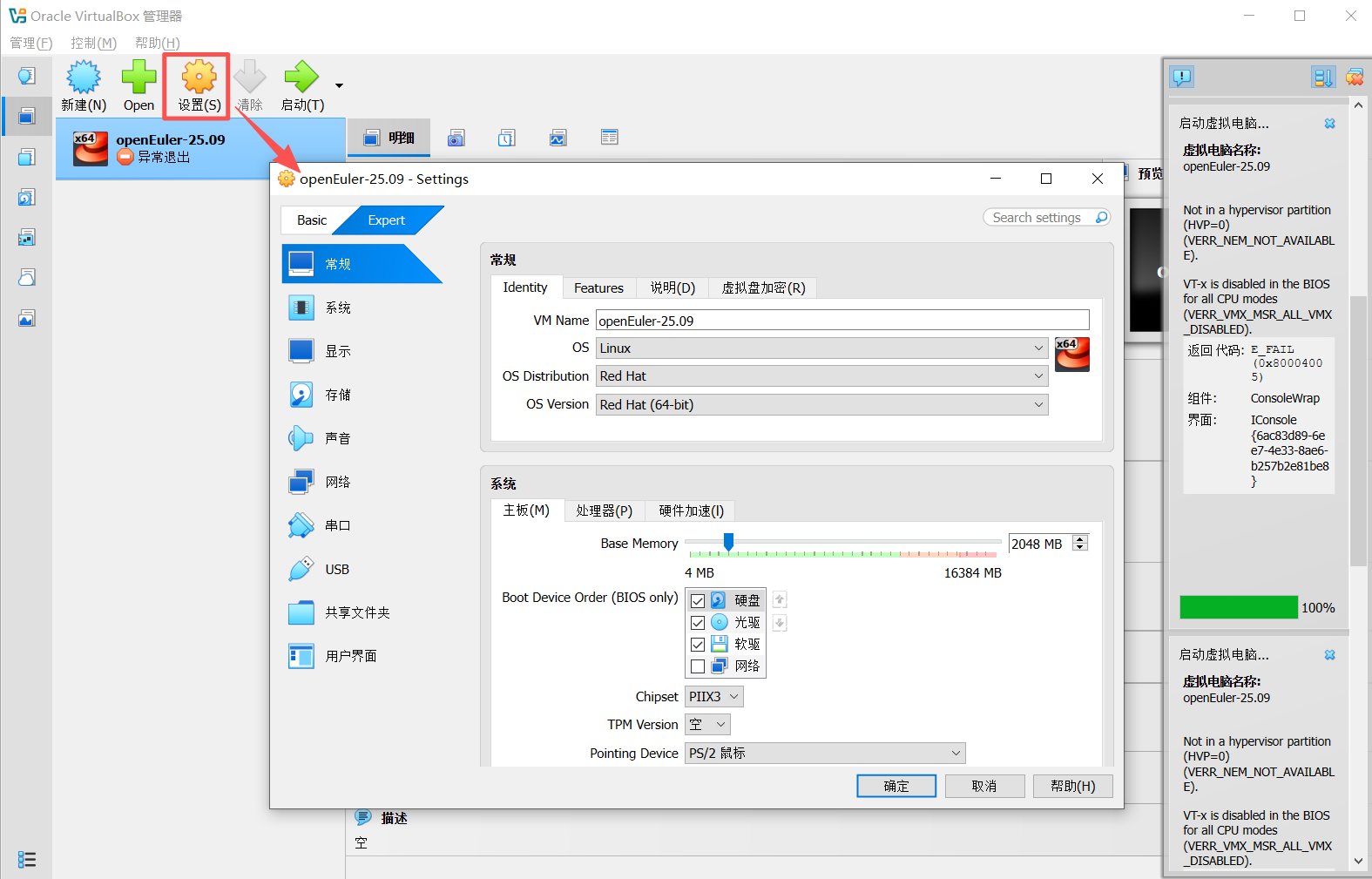 - 在VirtualBox主界面,选择新创建的虚拟机,点击顶部的"设置"按钮(齿轮图标)。
