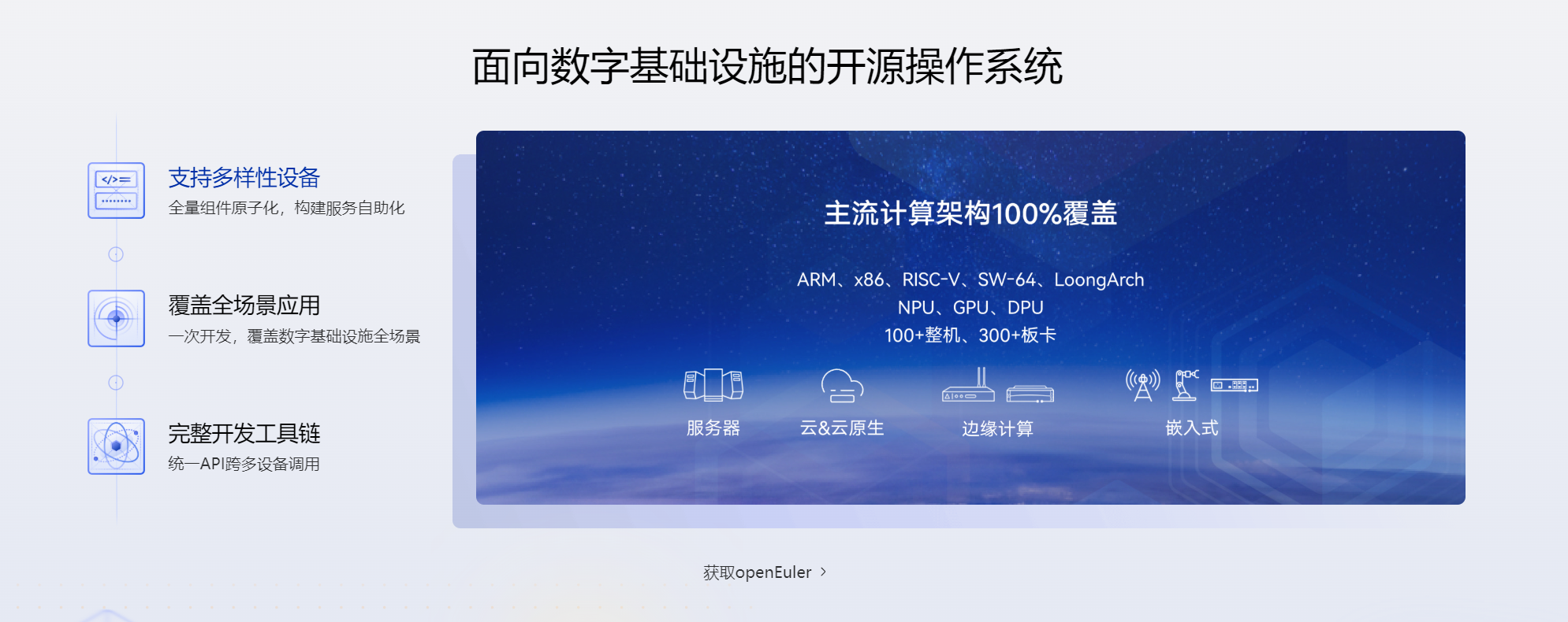 openEuler是由开放原子开源基金会孵化的全场景开源操作系统项目,面向数字基础设施四大核心场景(服务器、云计算、边缘计算、嵌入式),全面支持ARM、x86、RISC-V、loongArch、PowerPC、SW-64等多样性计算架构
