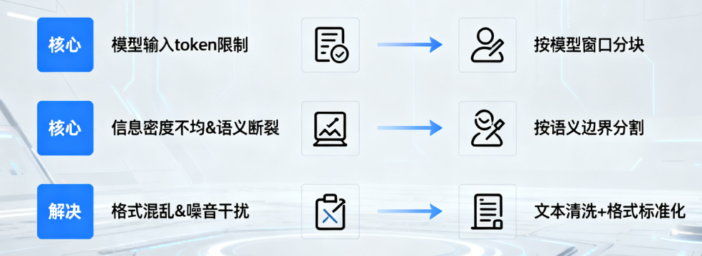 文本分块 | 按「固定长度+语义边界」分割文本(优先用段落、句子分隔符) | 避免截断完整语义,适配模型token限制 |