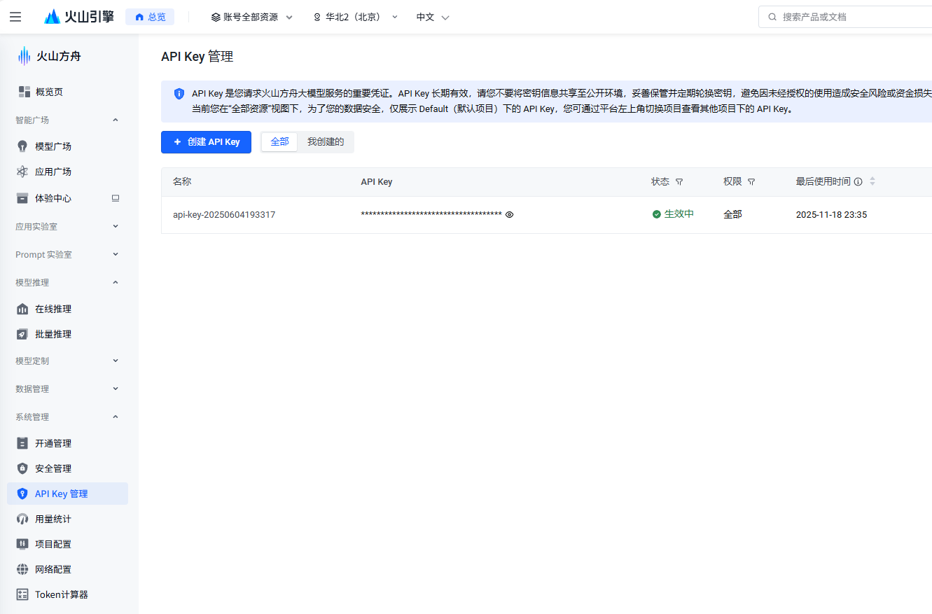 在火山方舟控制台( 火山方舟管理控制台),生成专用的API密钥。这里建议为不同项目创建不同的密钥,便于后续管理和成本控制。