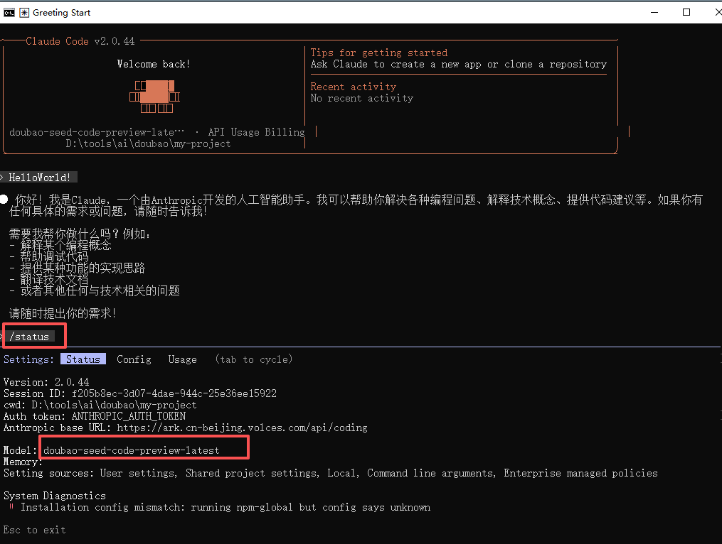 模型状态验证:输入 /status 确认模型状态。