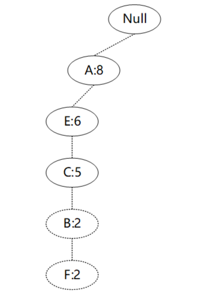 以构建F节点的条件模式基为例,F节点在FP-tree中只有一个子节点,因此只有一条路径{A:8,E:6,C:5,B:2,F:2},得到F节点的FP子树如图所示。