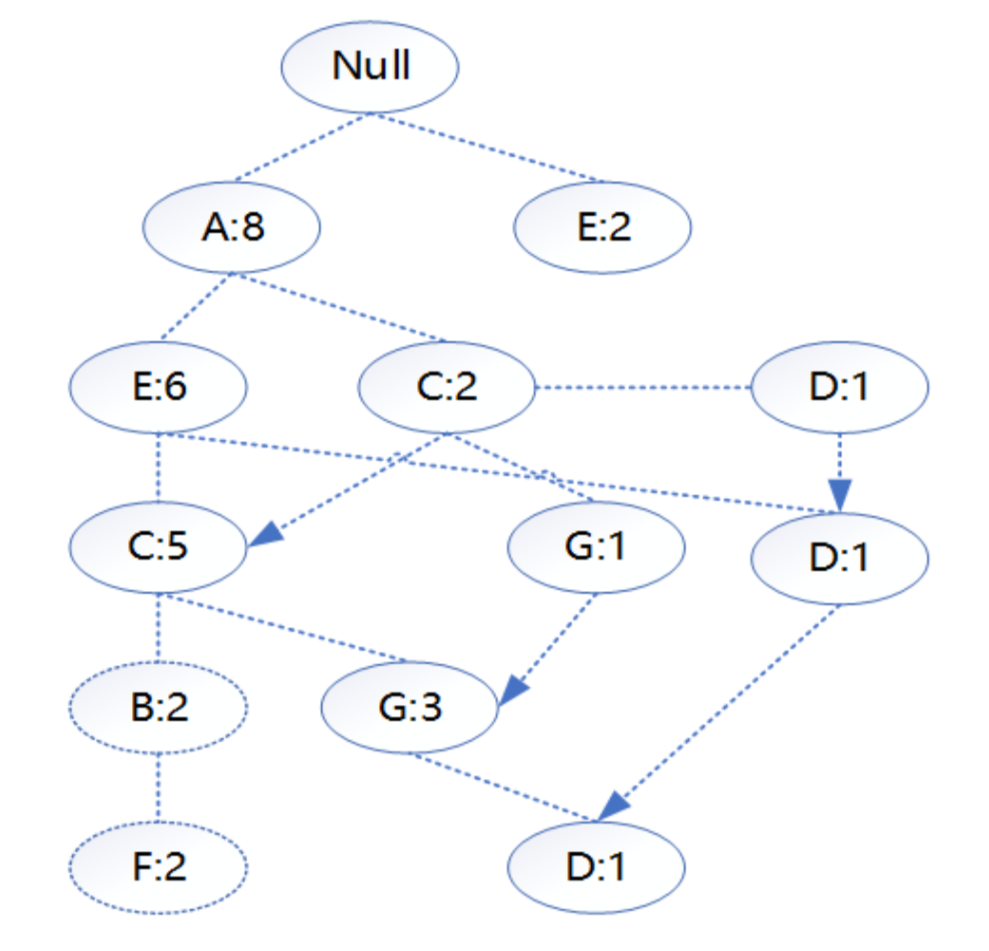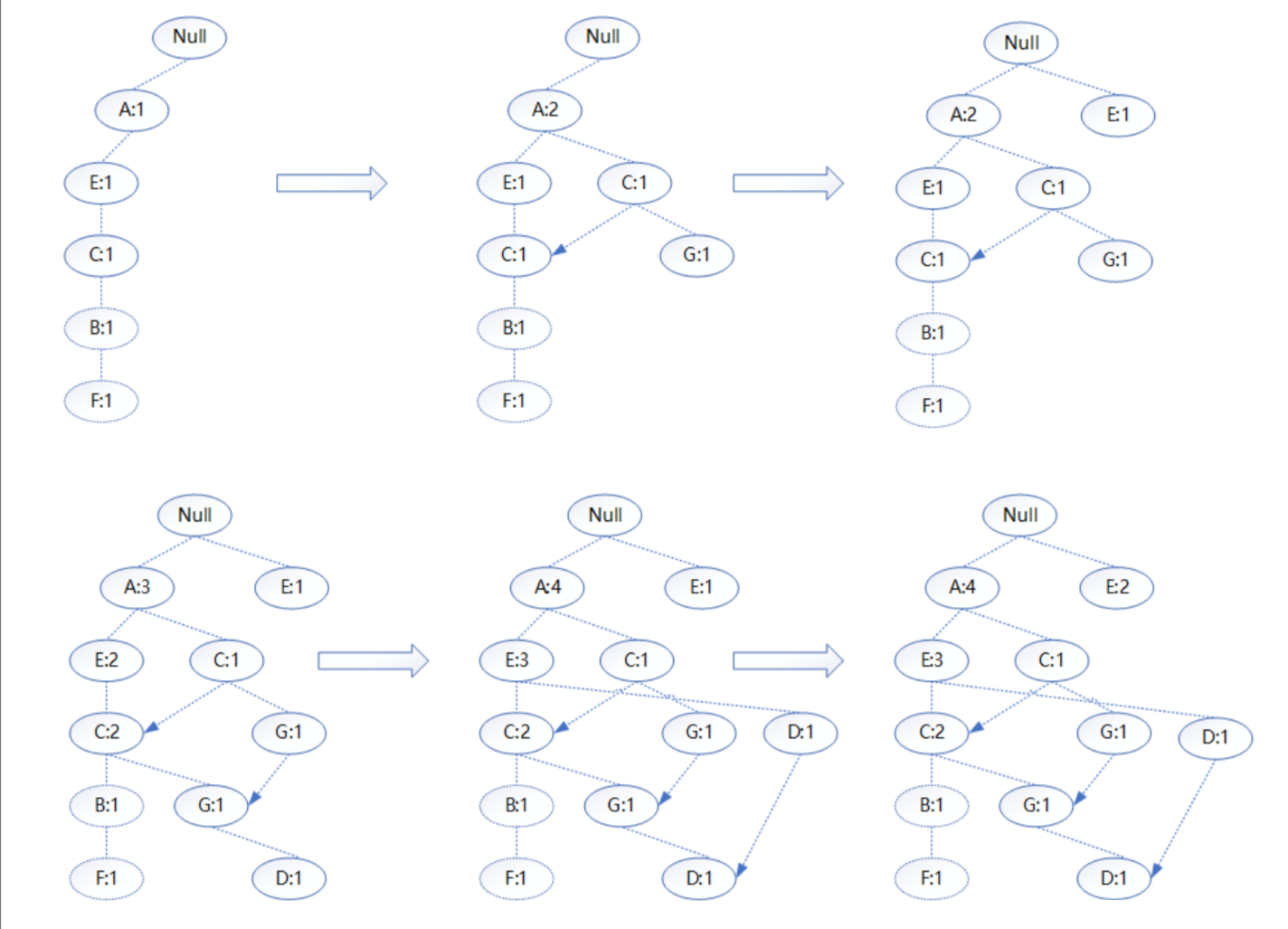 读入第四条数据“A,E,C,G,D”,在C节点处延伸一条新路径,共用的“A,E,C”计数加1,新建的节点计数为1。