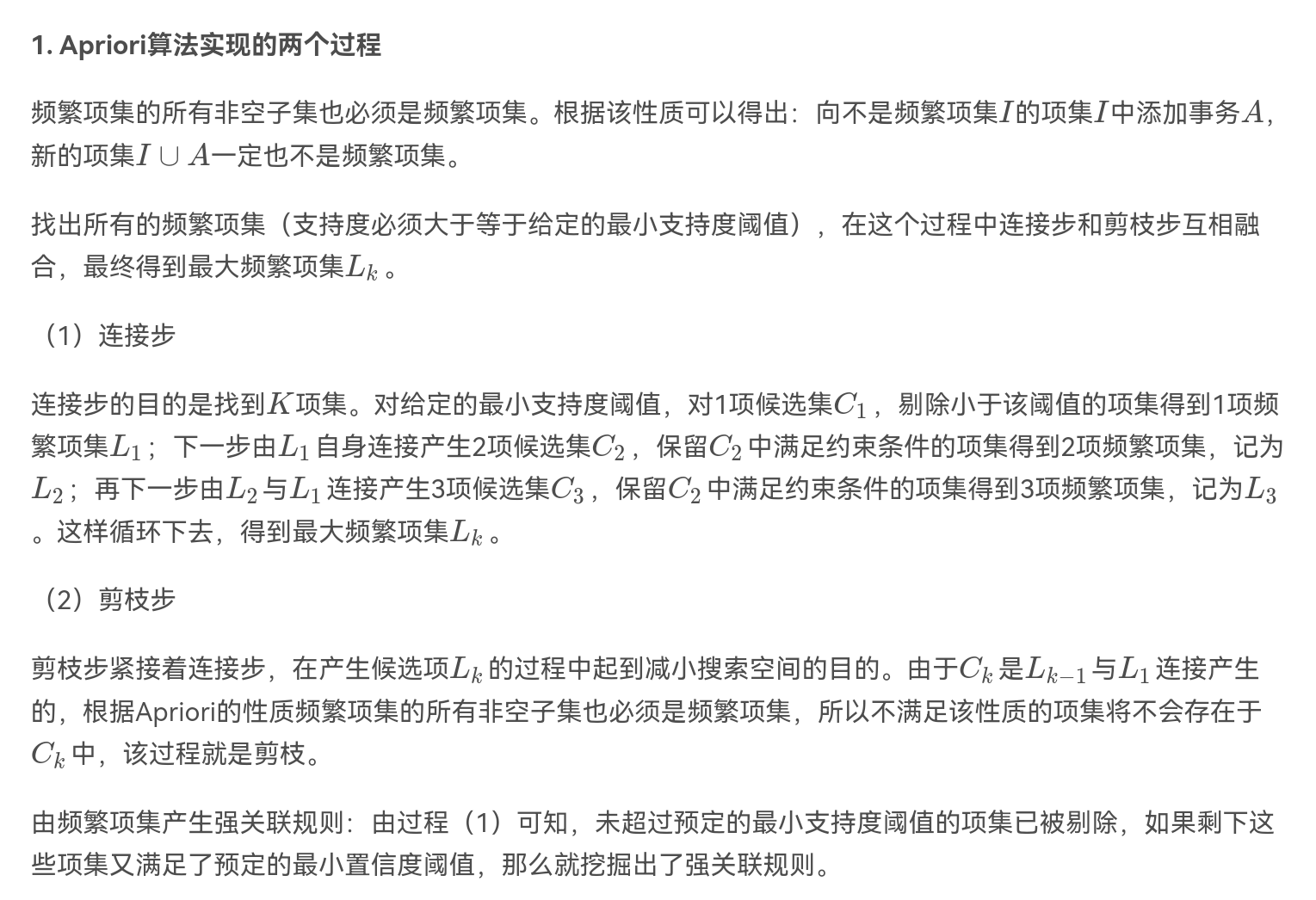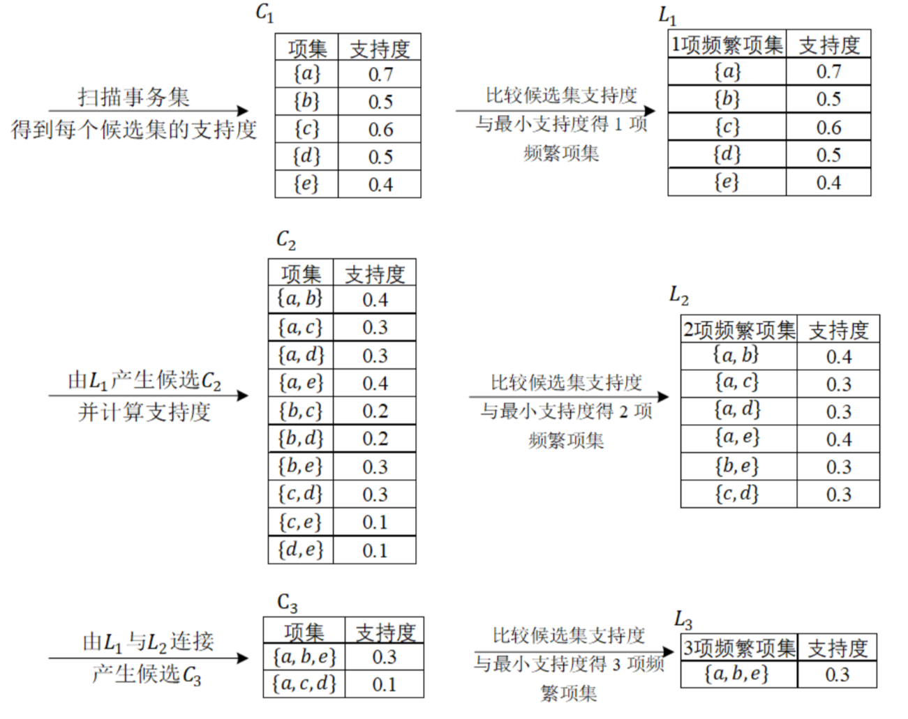 Apriori算法的主要思想是找出存在于事务数据集中的最大的频繁项集,再利用得到的最大频繁项集与预先设定的最小置信度阈值生成强关联规则。