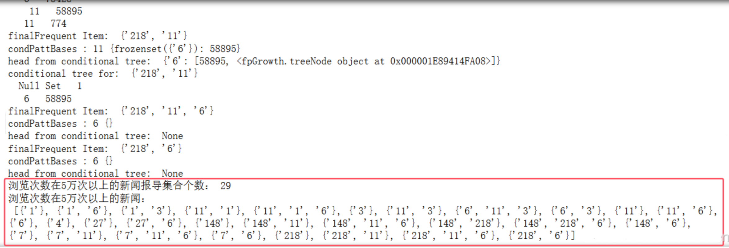 在Python中实现FP-Growth算法挖掘新闻门户的点击流数据的代码,结果如下。