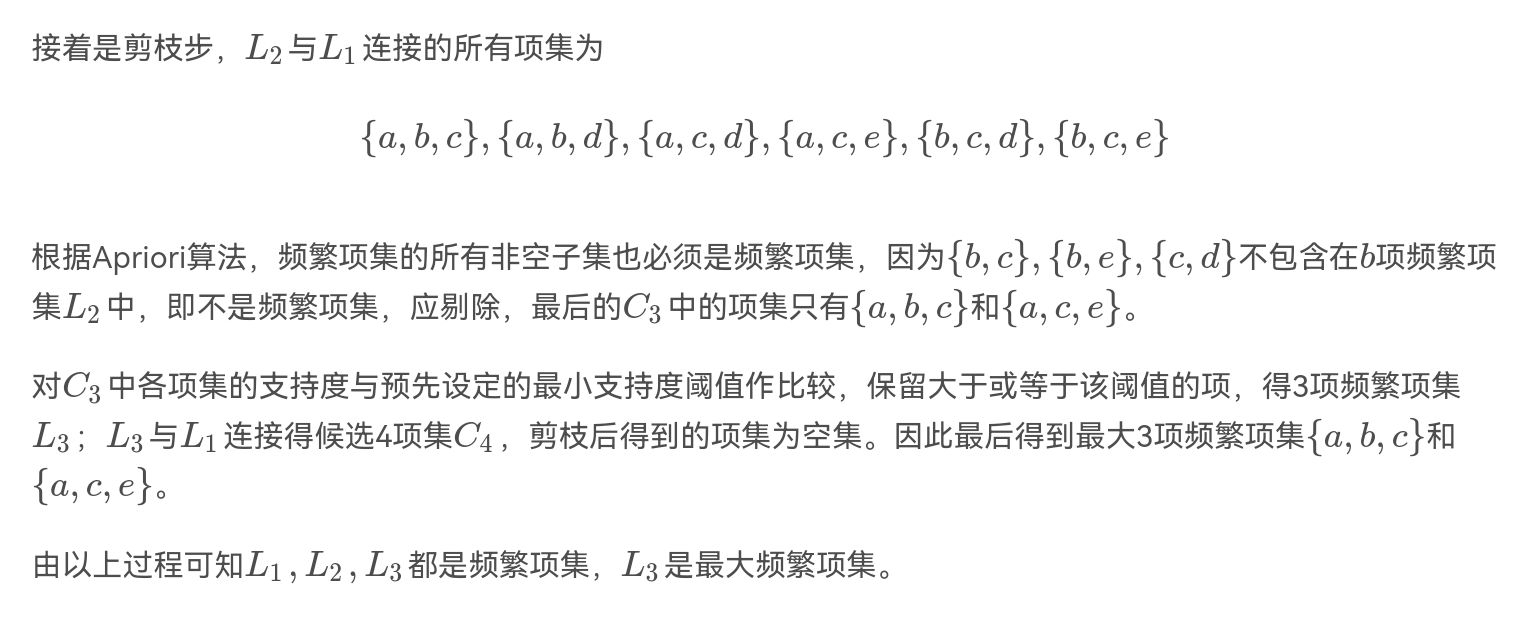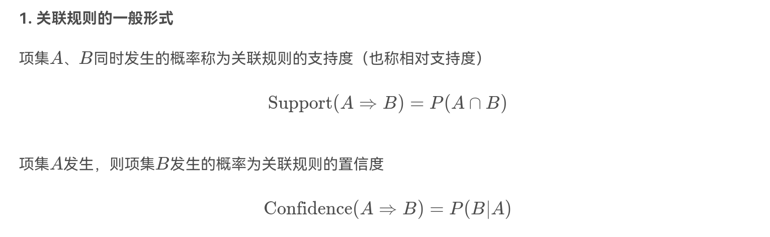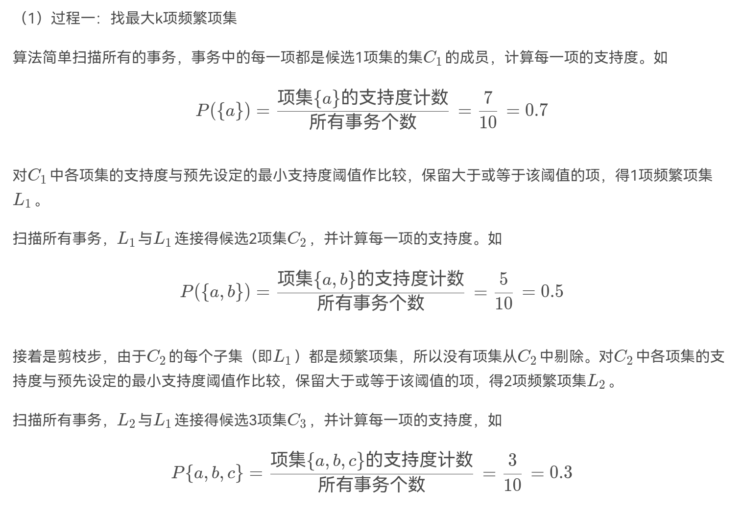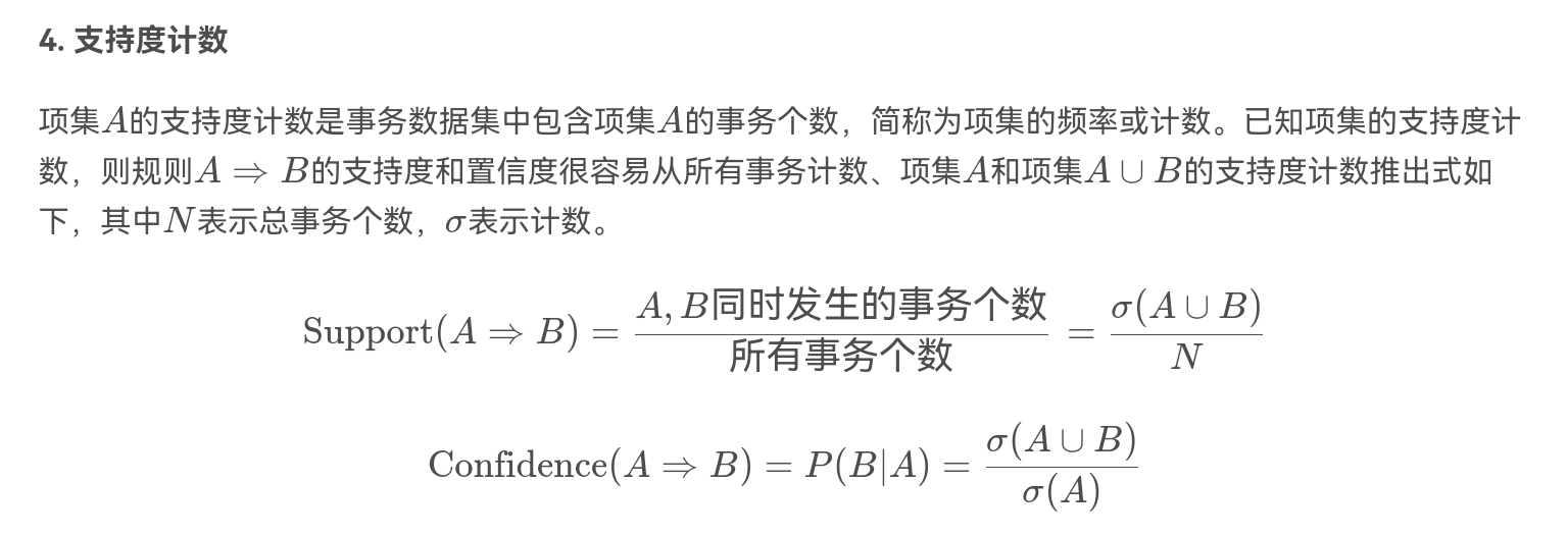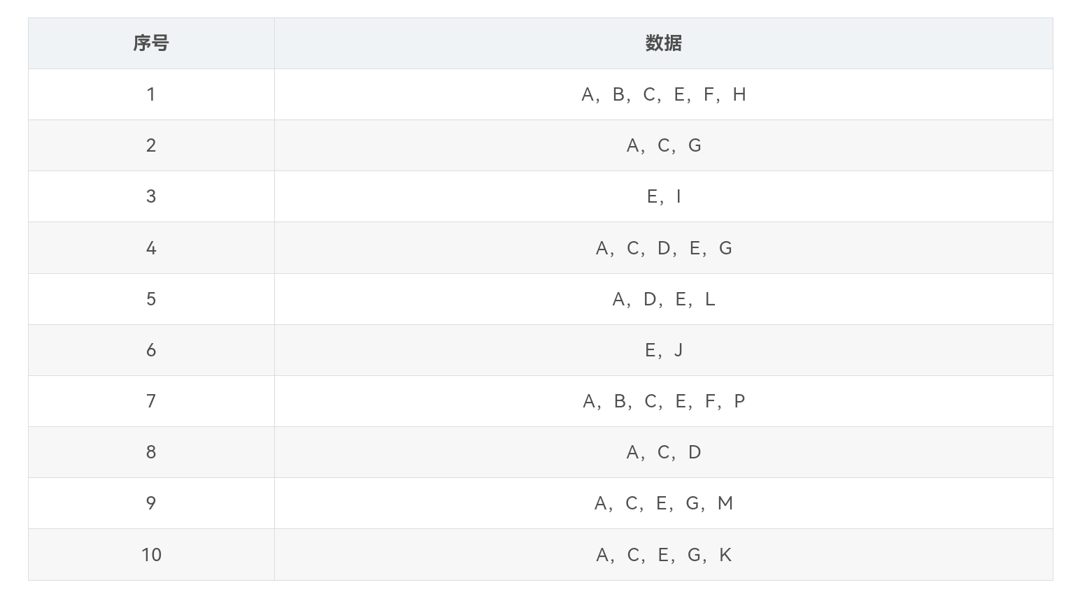 项集是项的集合。包含k个项的项集称为k项集,如集合{牛奶,麦片,糖}是一个3项集。 项集的出现频数是所有包含项集的事务计数,又被称作绝对支持度或支持度计数。 如果项集$I$的相对支持度满足预定义的最小支持度阈值,则I是频繁项集。频繁k项集通常记作L_k。