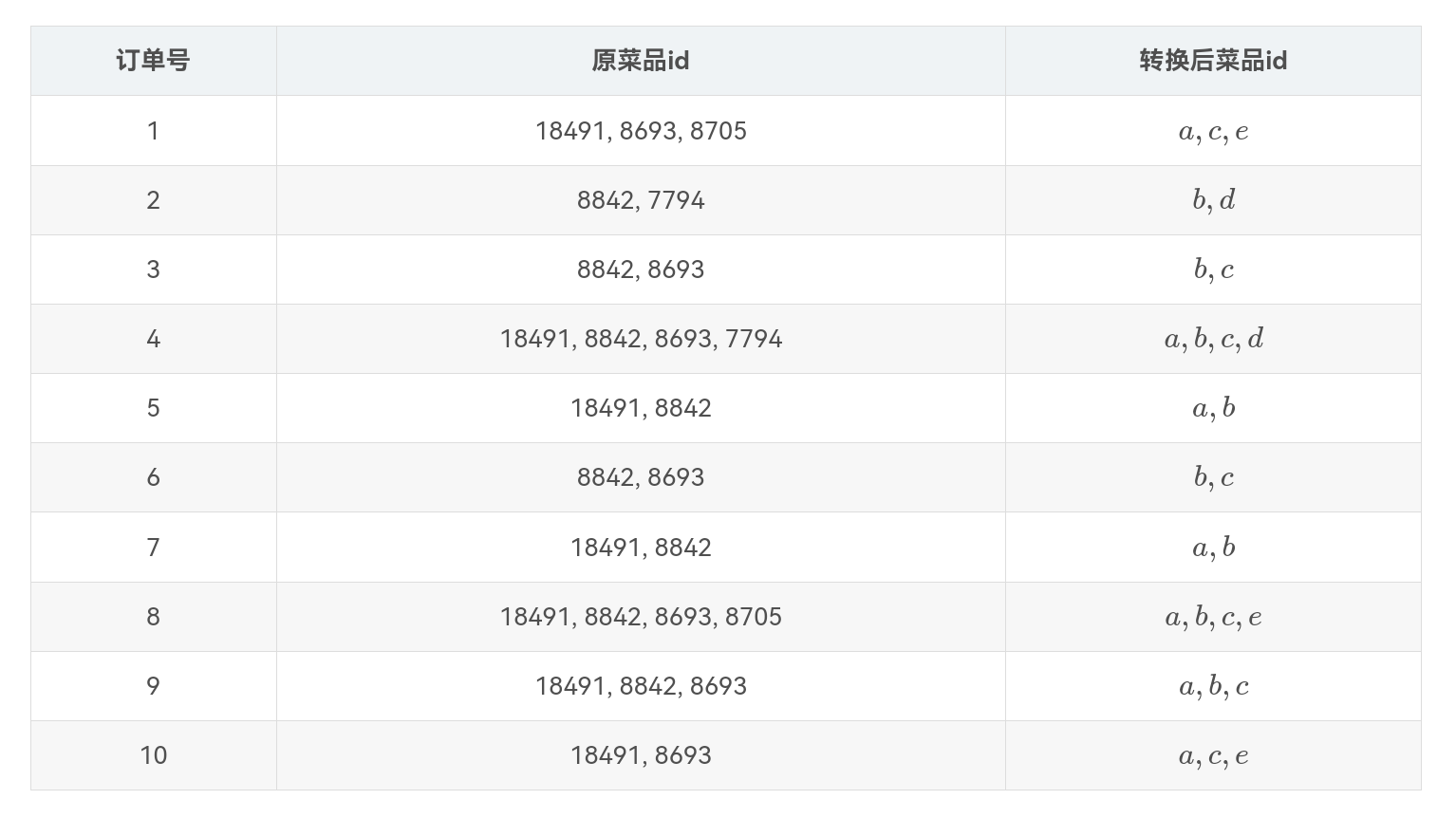 首先将上表中的事务数据(一种特殊类型的记录数据)整理成关联规则模型所需的数据结构,从中抽取10个点餐订单作为事务数据集,设支持度为0.2(支持度计数为2),为方便起见将菜品{18491,8842,8693,7794,8705}分别简记为{a,b,c,d,e},如表所示。