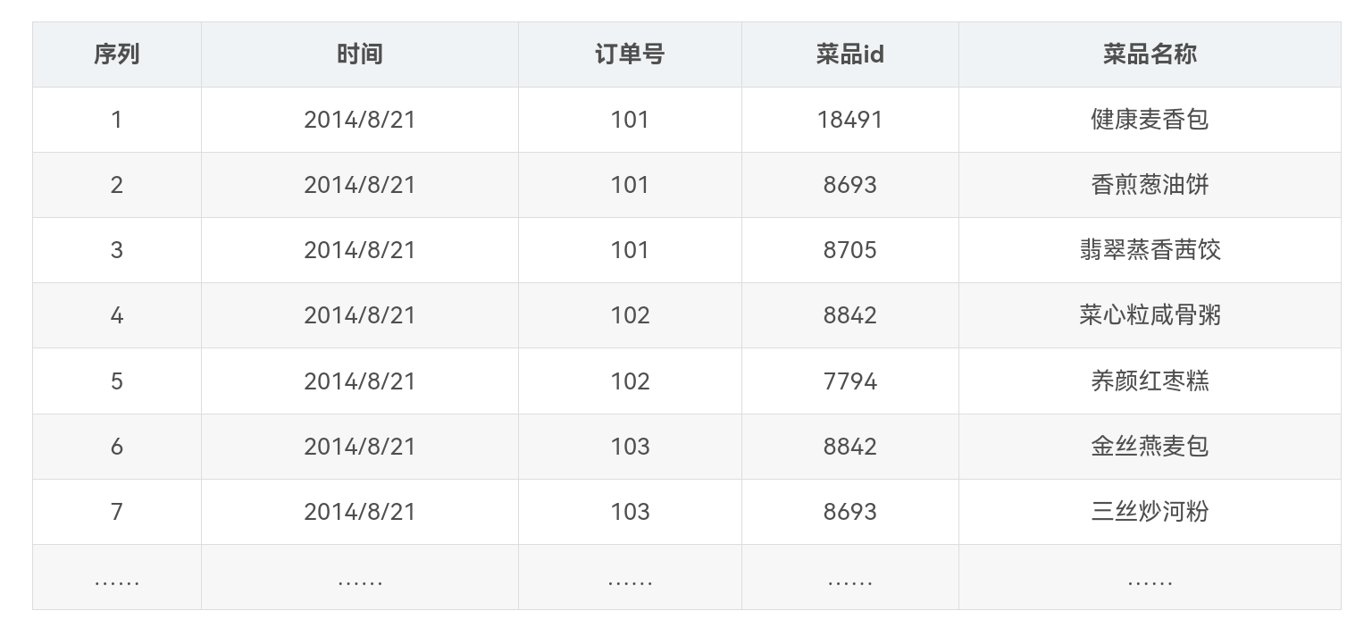 结合餐饮行业的实例讲解Apriori关联规则算法挖掘的实现过程。数据库中部分点餐数据如表所示。