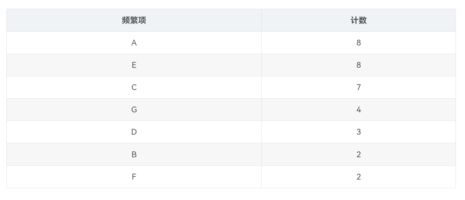第二次扫描数据,将每条数据中的1项非频繁项集删去,并按照项集的支持度降序排列。如数据项“A,B,C,E,F,H”,其中“H“为1项非频繁项集,剔除后按项集的支持度降序排列后的数据项为“A,E,C,B,F”,得到排序后的数据集如表所示。