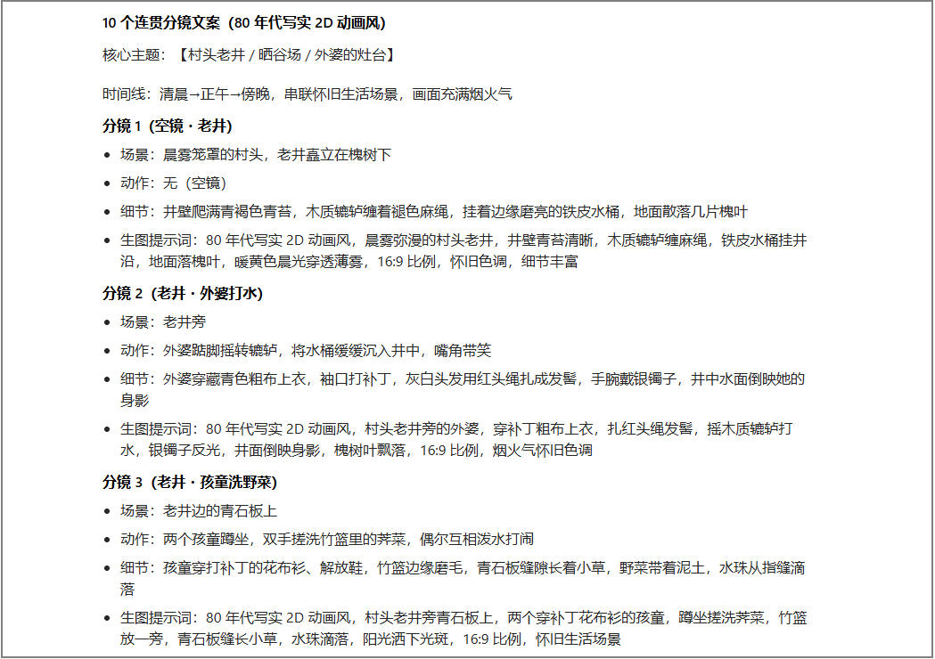 2、举个例子(我做的 版本),豆包生成的分镜 + 生图提示词: