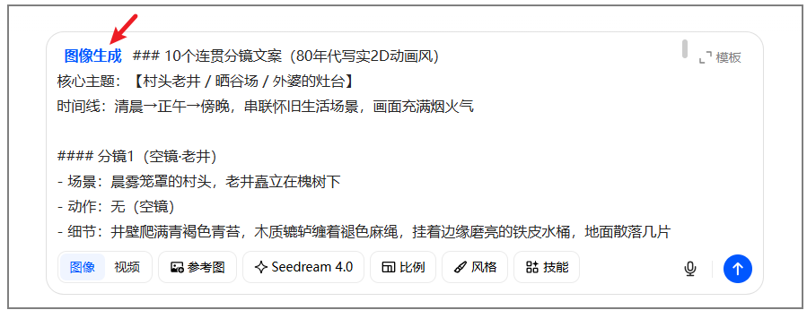 3、生成图片:打开豆包的 “图像生成” 功能,把每个分镜的生图提示词逐一粘贴