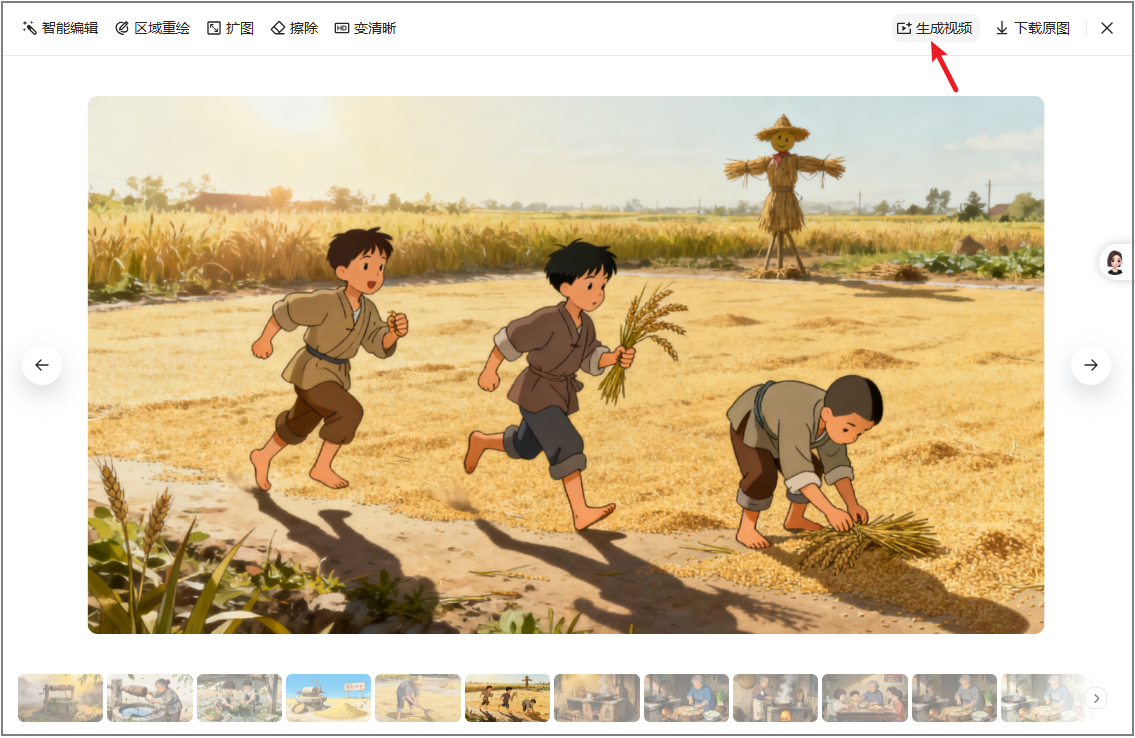 1、打开豆包,找到刚才生成的分镜图片,每张图片点击 “展开”,右上角点击 “生成视频”