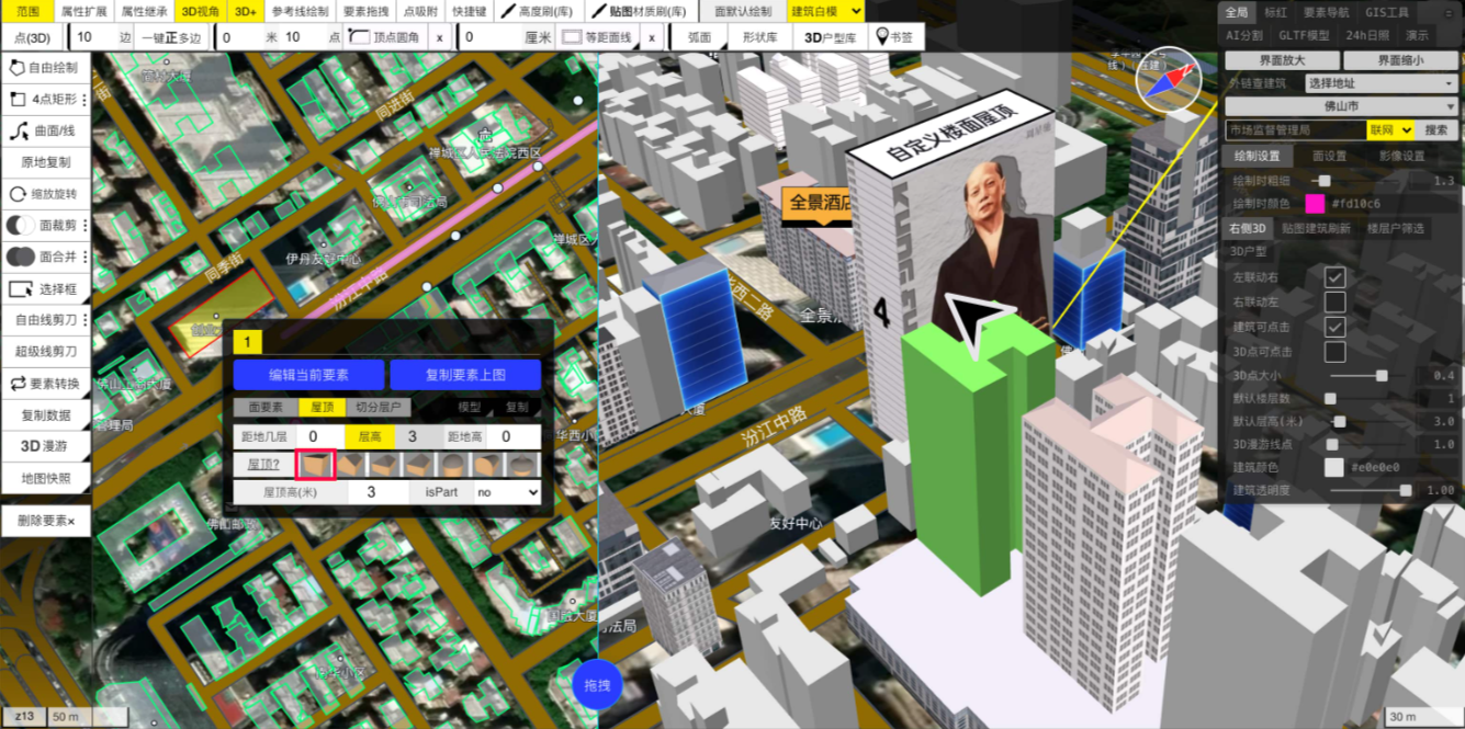 步骤1:资料上传与模型校准,上传所需建筑设计、地理空间等资料,完成3D建模,手动校准楼盘经纬度与周边环境模型;