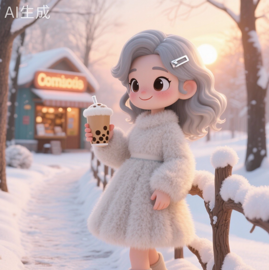 生成技巧:添加“雪花在毛绒上反射”的效果;如果女孩姿势过于常见,可以修改为“俯身微笑”的变化。
