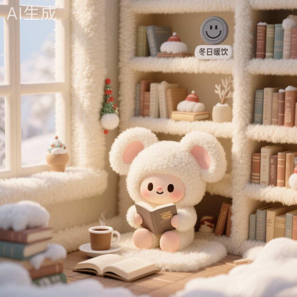 生成技巧:加入“柔和阳光透过窗户”的效果,营造温馨阅读氛围;通过替换雪球为书签来增加文化气息。