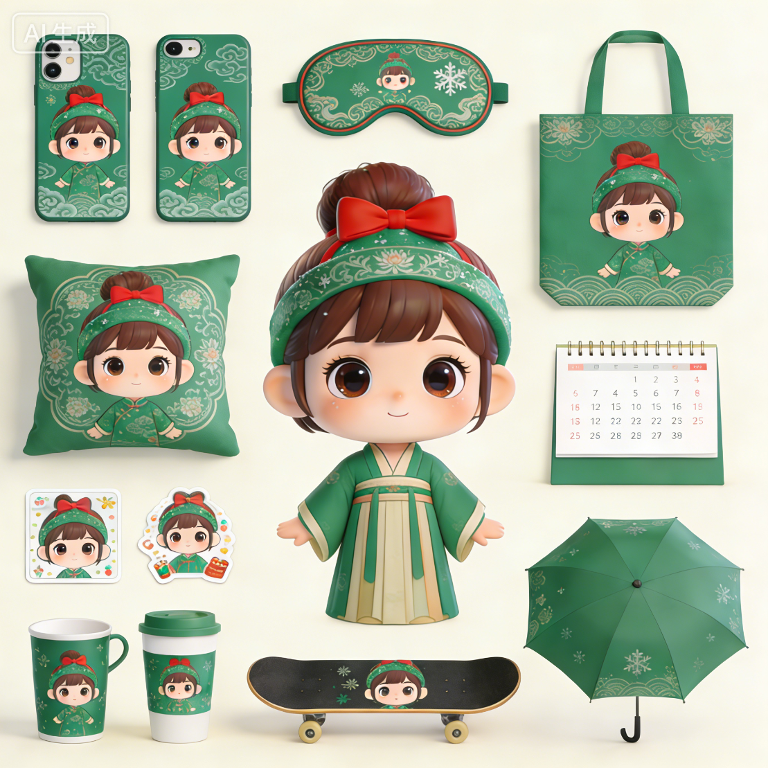 好消息是,AI工具的崛起让这一切变得so easy!这篇实操文章将基于一个“万能提示词”指令,教你如何上传IP图像,一键生成全套文创周边可视化图。核心是利用即梦、Canva、Midjourney、Stable Diffusion等AI绘画工具,输出一张综合图,涵盖9大类热门物品:手机壳、手提袋、抱枕、眼罩、贴纸、杯子、日历、滑板、雨伞。风格锁定中国风绿色系,浅色背景,主形象居中,IP图案完美印在每个产品上。零售商用此图可直接制作产品提案、电商视觉、甚至供应链对接,解决设计效率低、成本高、响应慢的痛点。