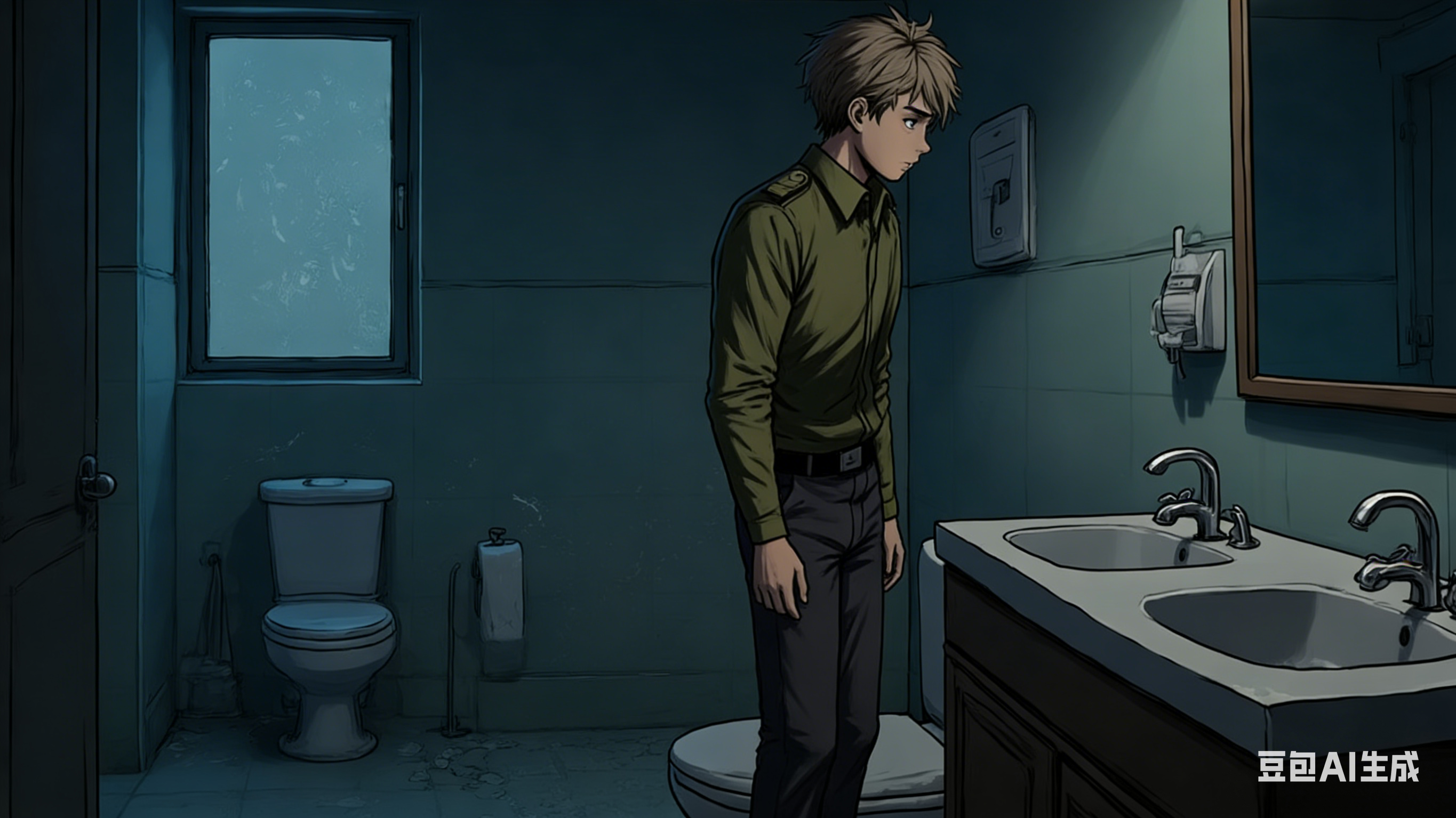 5 | 卫生间打开所有水龙头 | 动漫惊悚风格,卫生间昏暗蓝调氛围: 主角依次打开所有水龙头(镜头扫过每个水龙头出水的动作) |