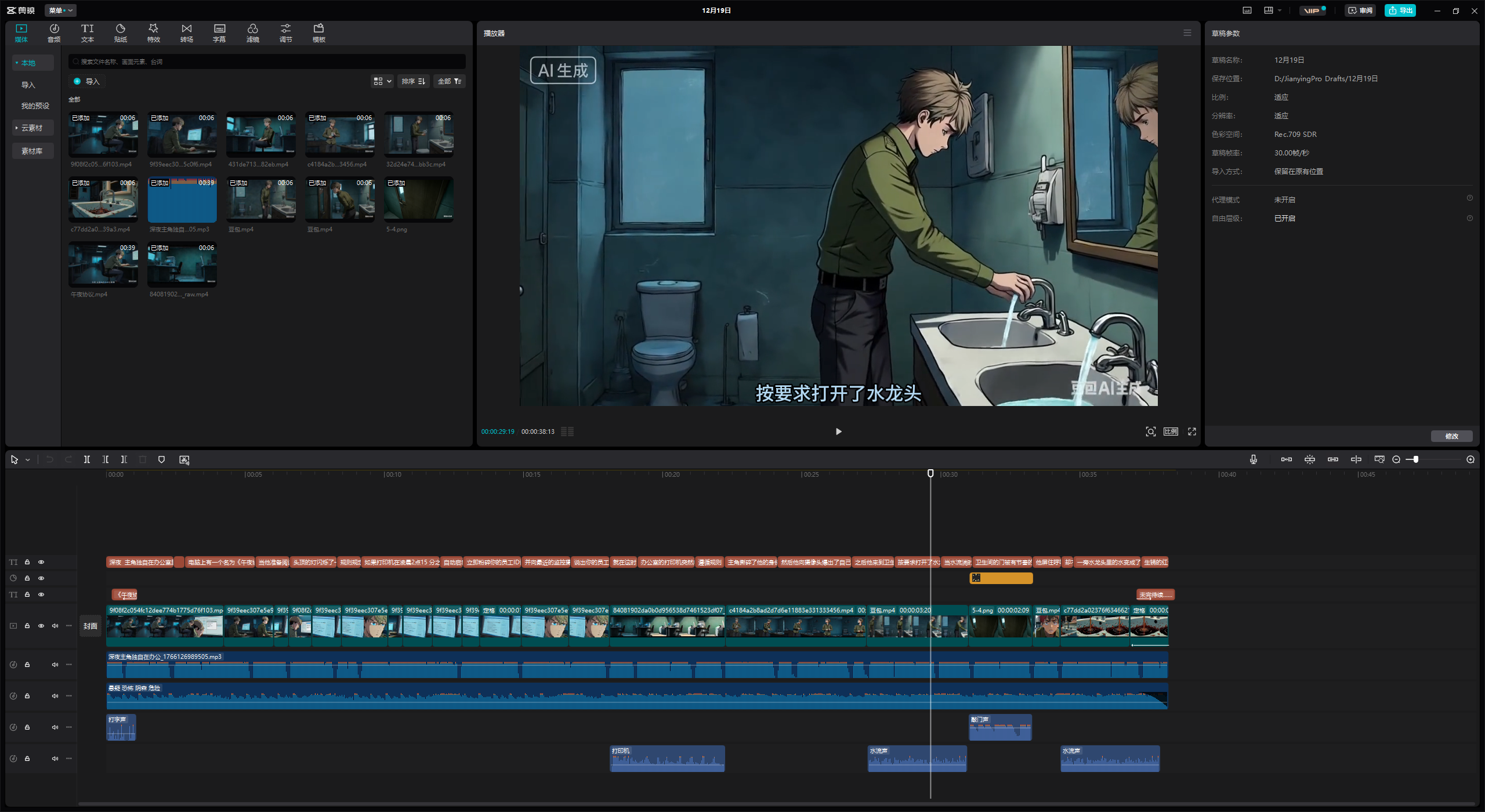 - 导入素材排序:将7段无水印视频、旁白音频一起导入剪映,按分镜顺序拖动排列整齐,根据画面增加合适的音效,比如敲门声、打印机、水流声等。