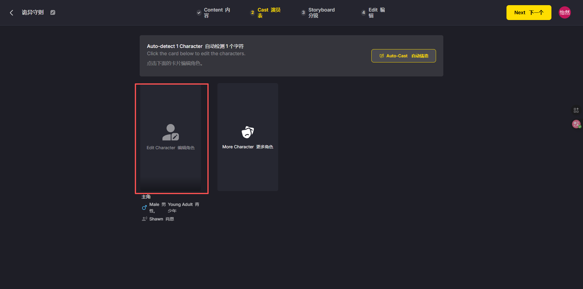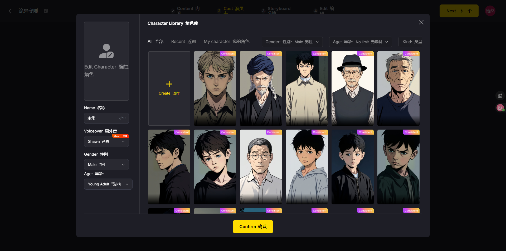 - 调整分镜+确认角色:AI会自动匹配6个分镜(对应故事节点),若某分镜遗漏关键内容(比如少了“碎纸机运转”镜头),直接点击分镜编辑框补充;角色选择时,可复用平台预设的悬疑风角色,或自定义“穿工装的男性主角”,确认后点击“Confirm→Next”。