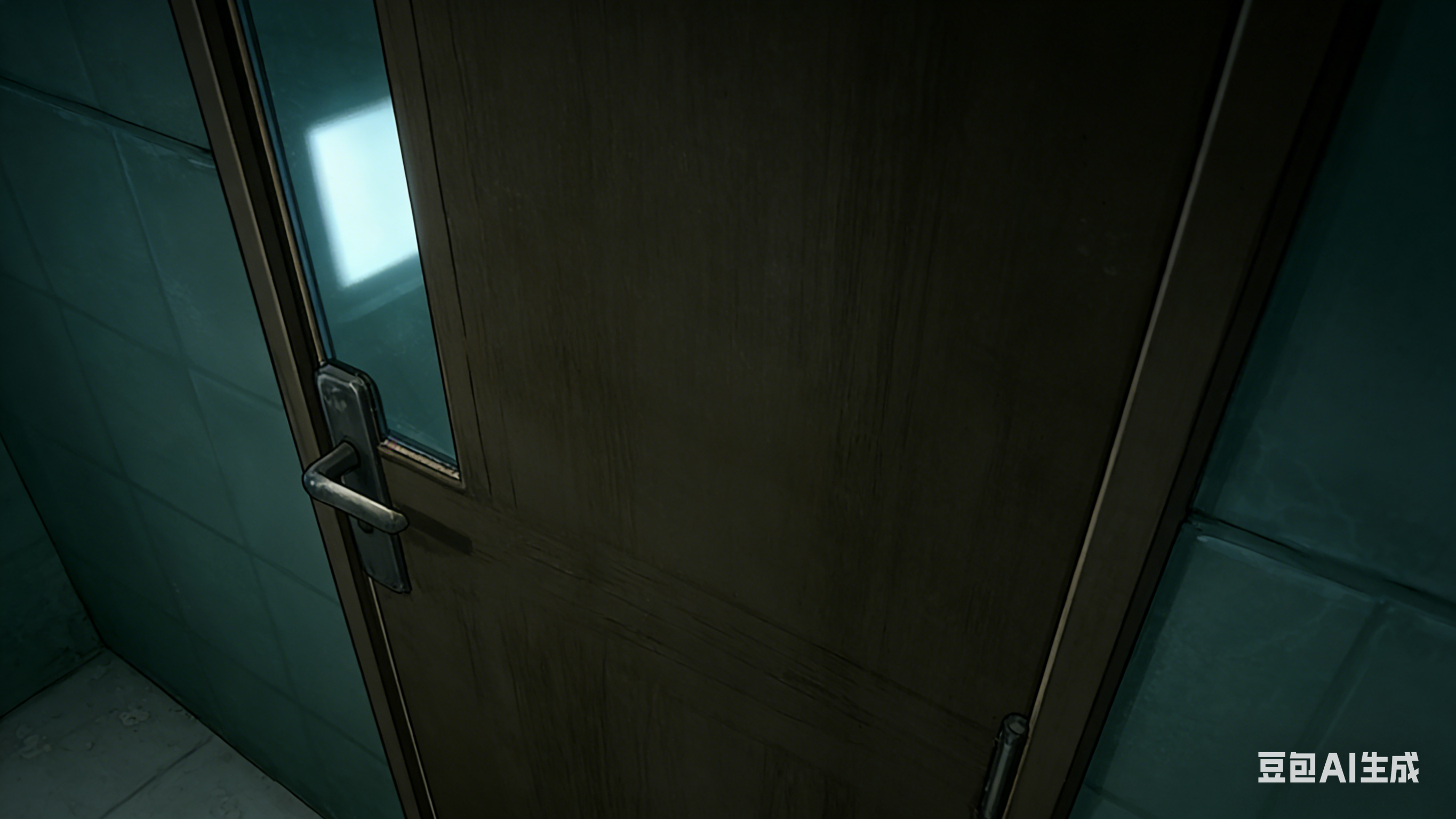 主体(特写):卫生间深色木质木门特写(与参考图门样式、质感一致,记住,门把手在门的左侧,门把手上面有一溜长方形的玻璃,一定要记住这些细节),门体带轻微磨损痕迹,金属把手处于 “微颤状态”(呼应持续的敲门声),门把手下方可见门与门框的细小缝隙环境:木门周围的局部环境(贴合参考图氛围),门的左右两侧露出浅蓝绿色瓷砖墙面(瓷砖纹理清晰),地面左下角露出浅灰瓷砖 + 少量细碎污渍,背景无多余元素(聚焦门体),氛围:整体冷暗蓝绿色调,压抑冷清的悬疑氛围拉满,光线仅来自小窗透入的微弱冷光(门体左侧有微弱光影渐变)风格:与参考图一致的动漫插画风格,特写镜头下细节写实(木门纹理、金属把手质感),色彩饱和度低,光影压抑,与前两帧风格完全统一