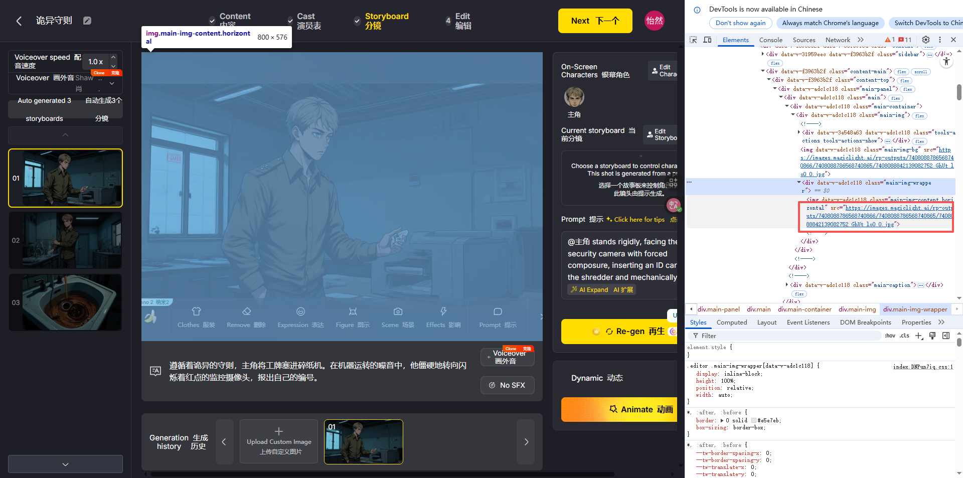 - 生成素材+独家下载秘籍:AI生成各分镜静态图和旁白,若内容不符,点击“再次生成”(每日免费额度足够);素材保存分两种方式:① 常规下载:点击图片左下角下载按钮直接保存;② 邪修秘籍(平台限制下载时用):谷歌浏览器中右击图像→点击“检查”→右侧源代码中找到图片链接→复制链接到新标签页→直接下载(亲测通用)。最后保存所有静态图并复制旁白文本备用。