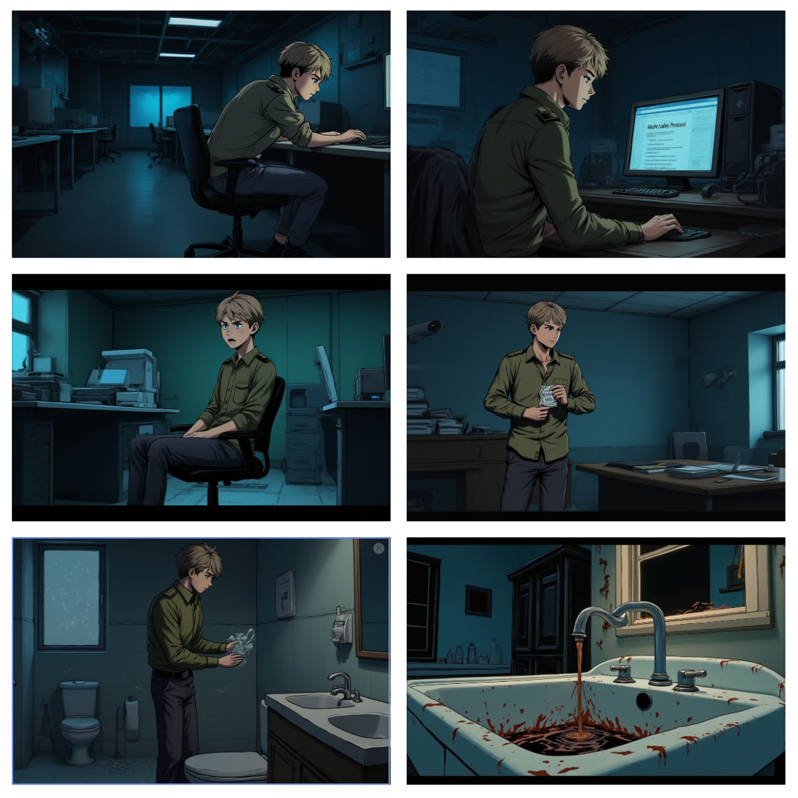 本次实操案例故事背景:遵循诡异守则,主角发现恐怖协议文件→主角阅读恐怖协议文件→打印机自动启动→主角将工牌身份证件销毁→转向监控报编号→卫生间打开所有水龙头→卫生间门被敲响→洗手池清水变锈红色。全程6个分镜,一步一步教你落地!
