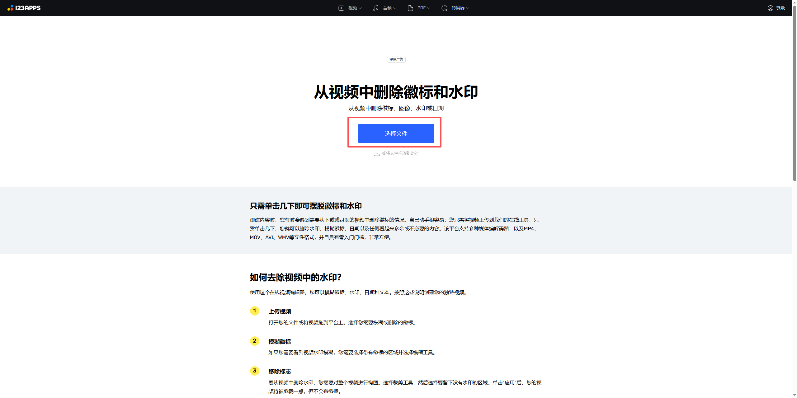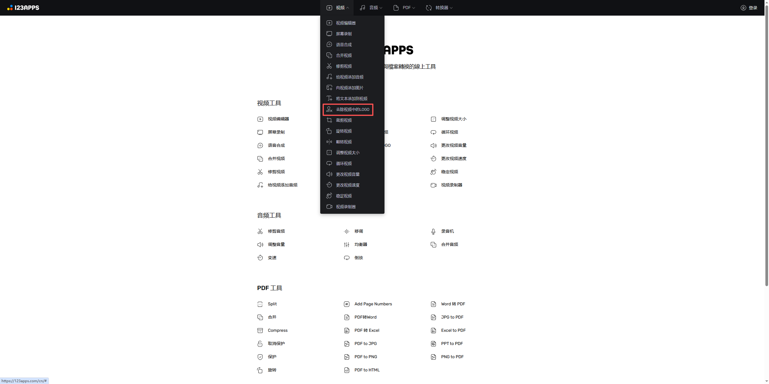- 打开123APPs官网,找到“去除视频中的logo”功能模块;