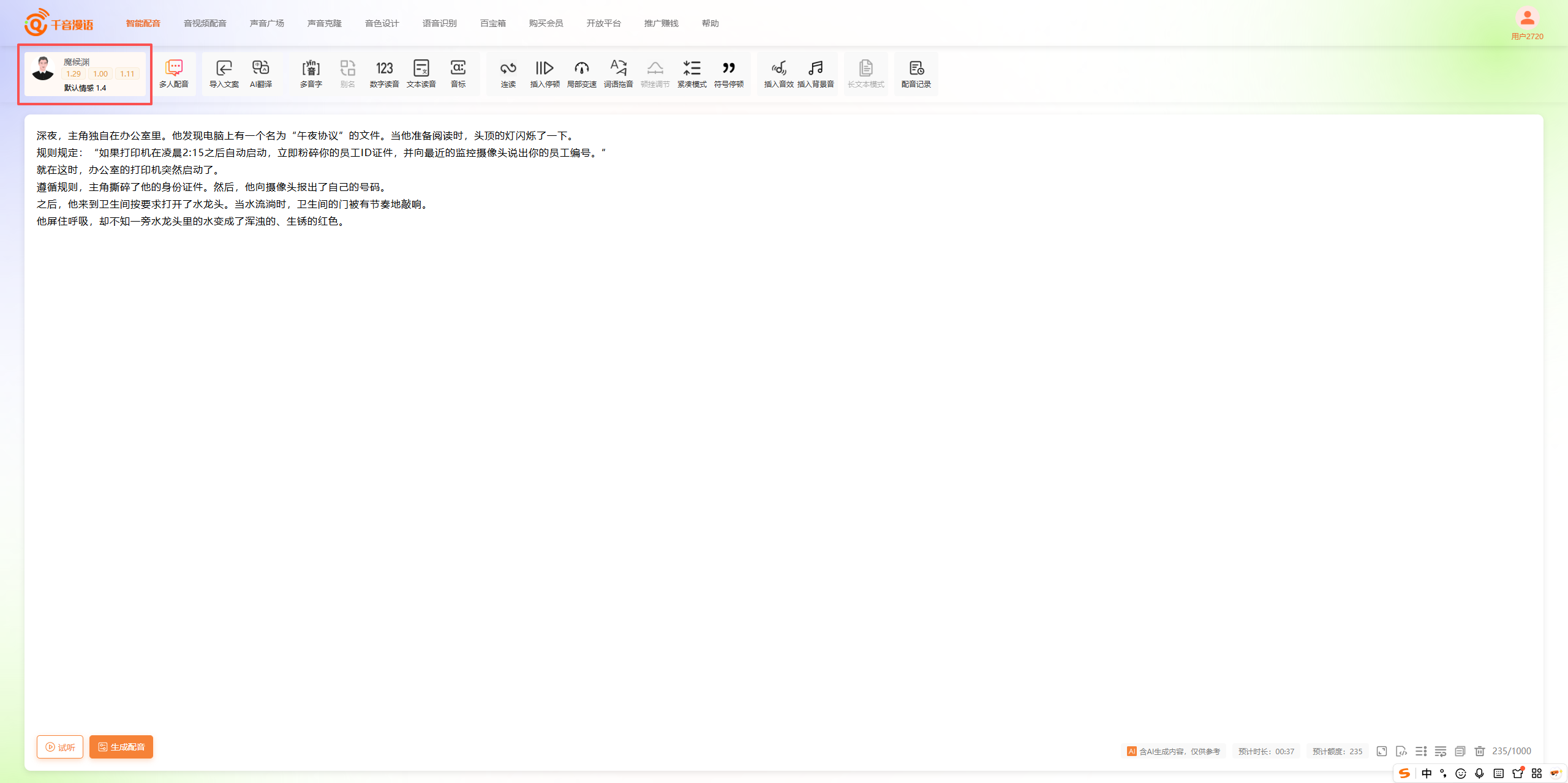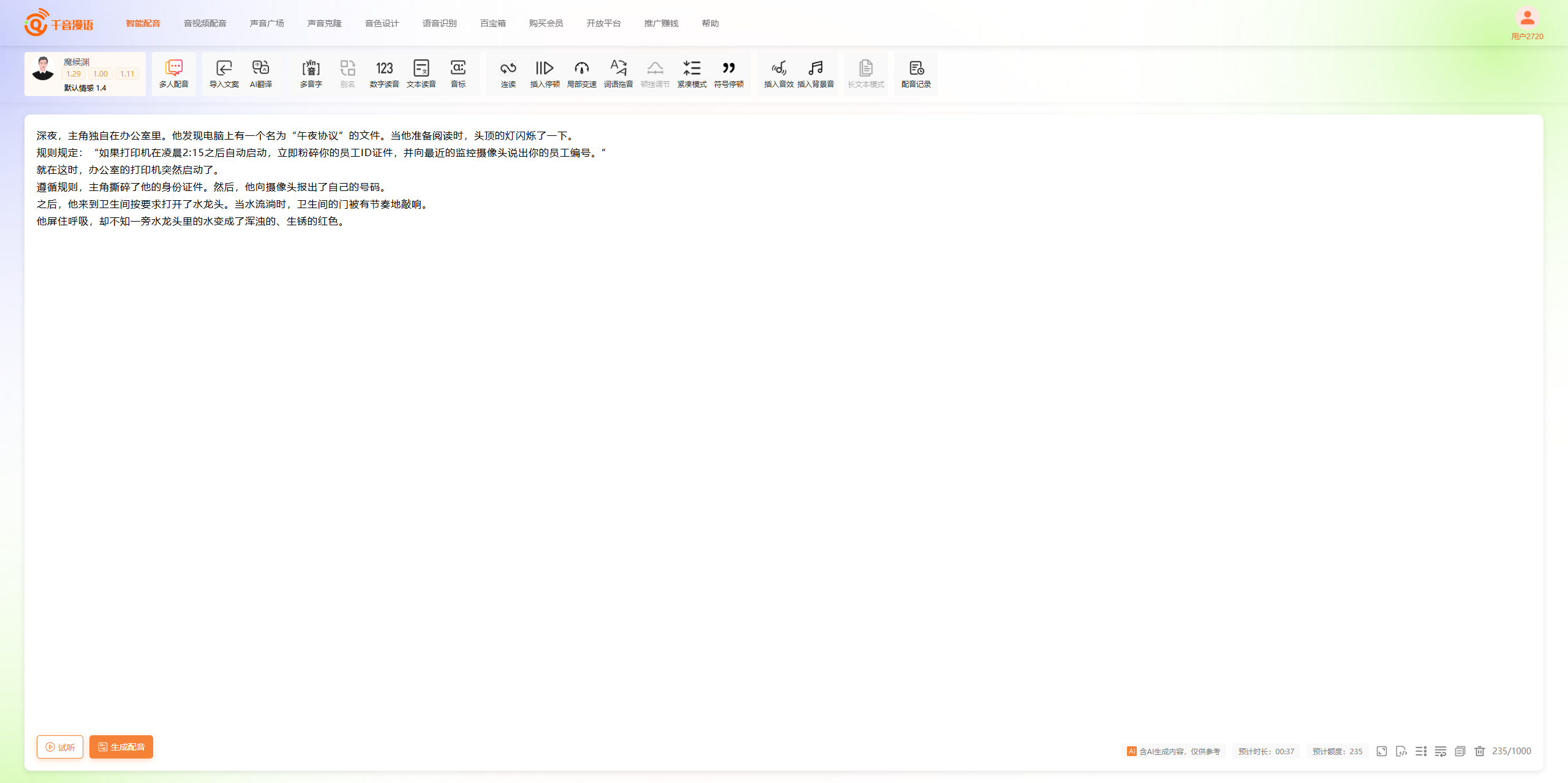 接下来我们就需要找一个垂直类的配音软件,来为我们的旁白配音了,我这里推荐一款 AI 工具——千音漫语,该工具的悬疑音色适配度高,重要的是完全免费,操作步骤简单: