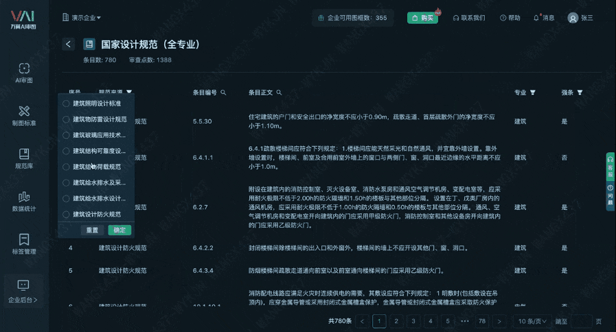 平台预置了五大专业常用的国家标准,支持输入关键词快速引用,并且可以自动填入条文详细说明。还可批量导入企业标准。