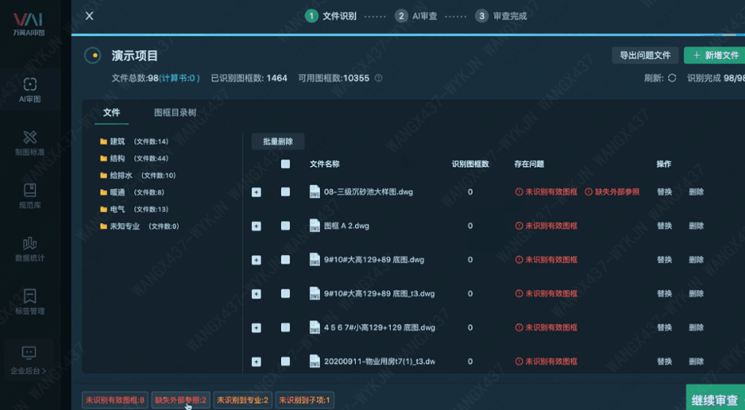 图纸有没有损坏,外部参照有没有丢失,图签关键信息是否完整,这是AI审图的基础。AI审图提供图纸预检查功能,图纸无需整理,一键上传后可自动进行预检查。