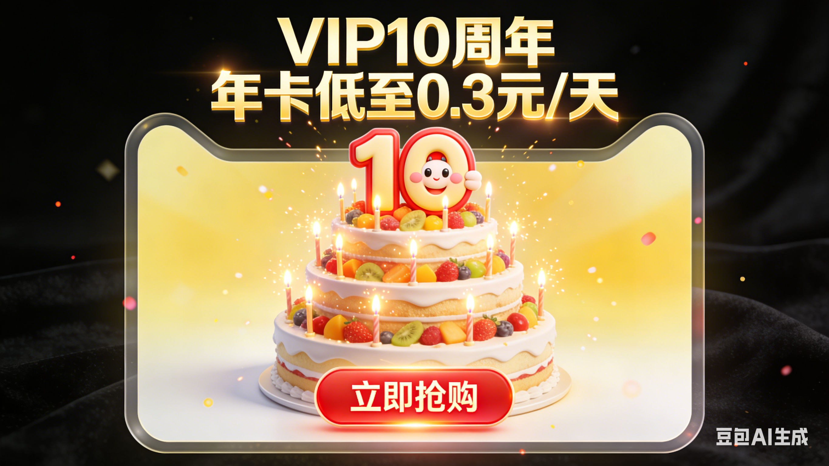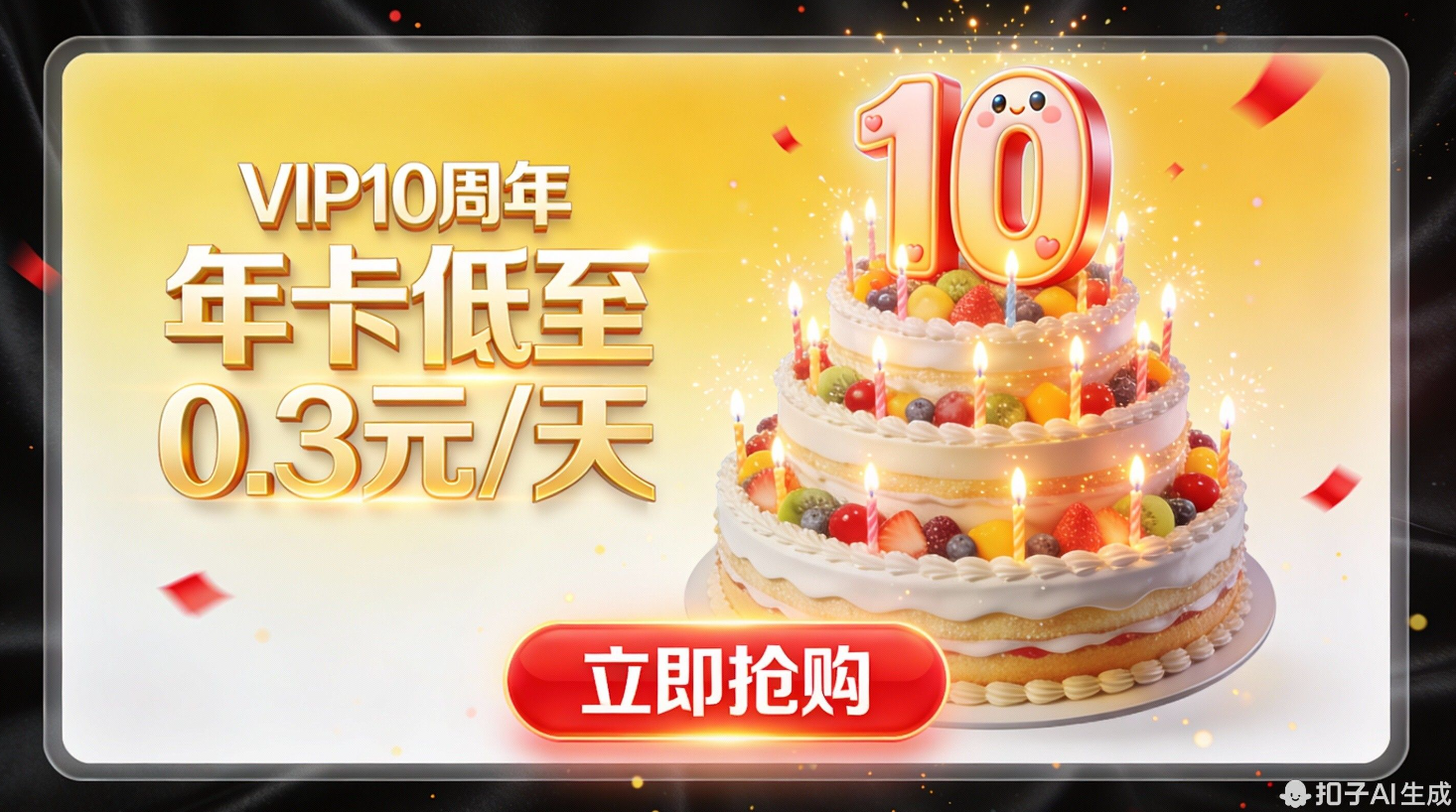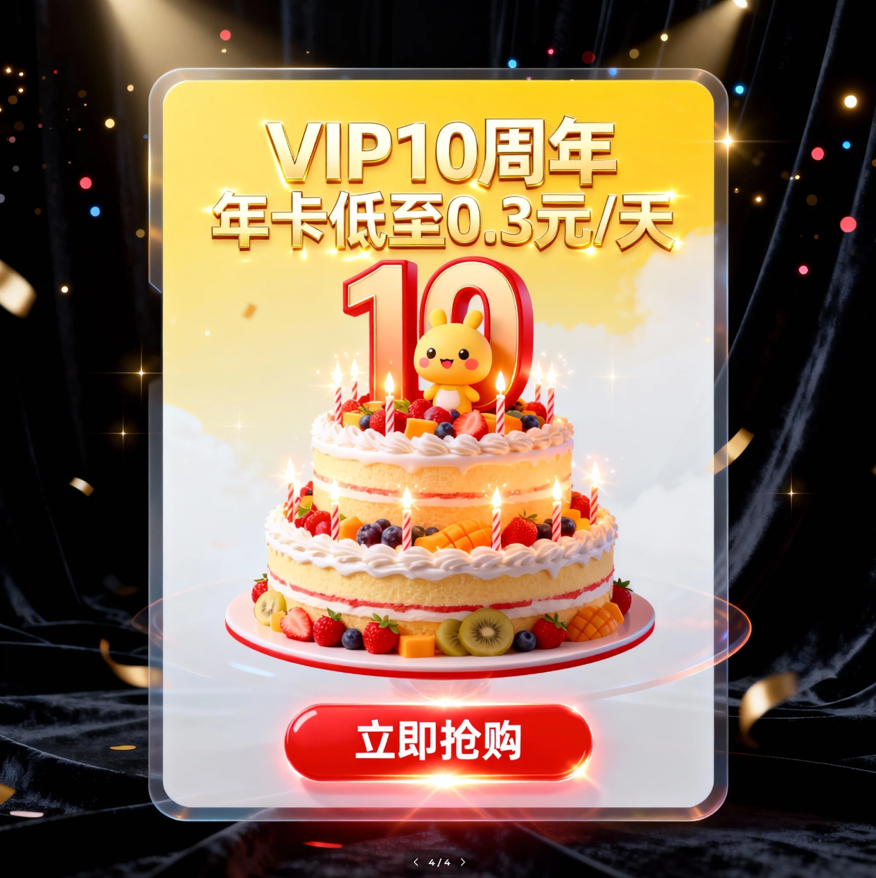 - 继而细节:蜡烛、水果、文字、按钮(“VIP7周年 年卡低至0.3元/天”)。