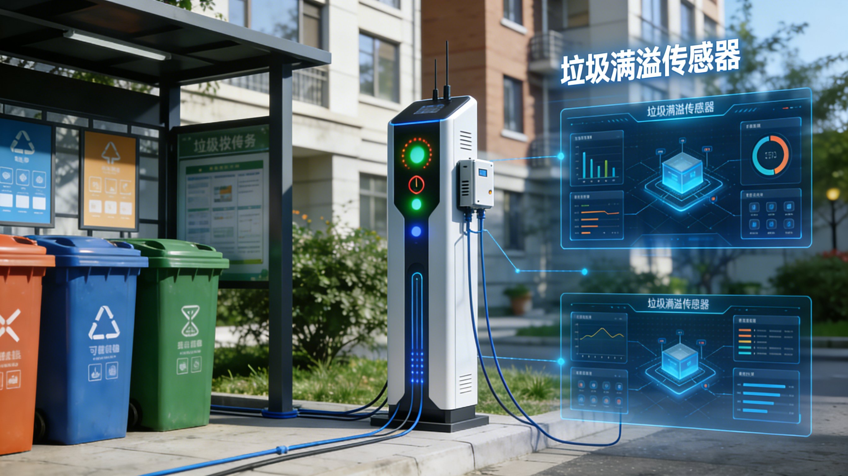 垃圾满溢传感器:安装在垃圾桶内,当垃圾达到一定容量时,自动向调度中心发送清运工单。